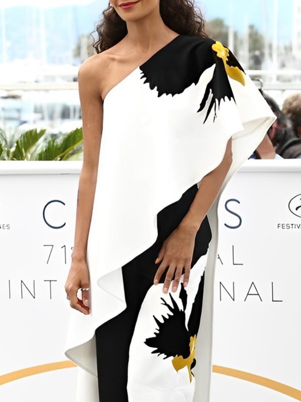 Loose Sleeveless Asymmetric Flower Print One-Shoulder Blouses&Shirts Tops