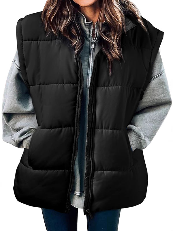 Loose Sleeveless Keep Warm Pockets Quilted Solid Color Zipper Stand Collar Padded Vest