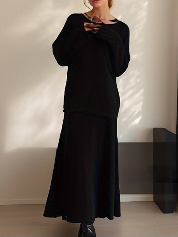 Loose Solid Color Long Sleeves Round-Neck Sweater Top + Skirt Two Pieces Set