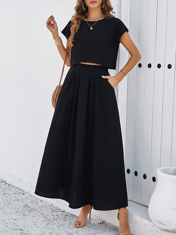 Loose Solid Color Round-Neck T-Shirt Top + Pleated Pockets A-Line Skirts Bottom Two Pieces Set