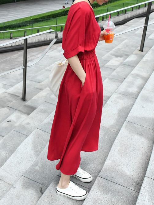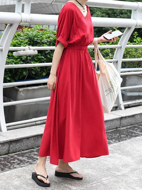 Loose Solid V-neck Short Sleeves Dress