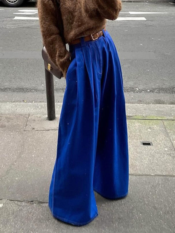 Loose Wide Leg Pleated Pockets Solid Color Pants Trousers