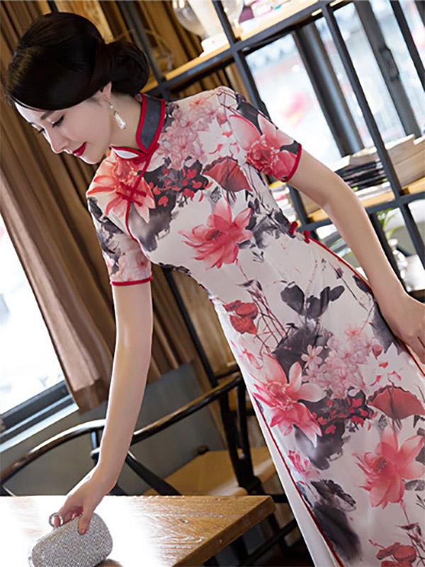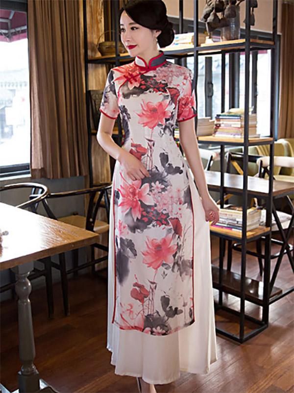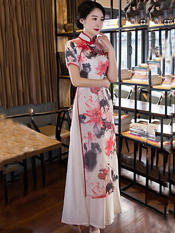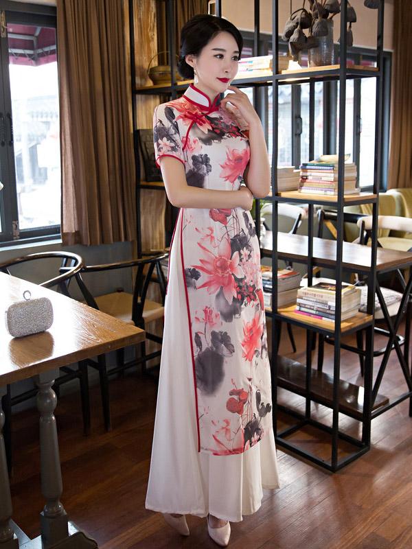 Lotus Print Split-side Ao Dai Long Cheongsam