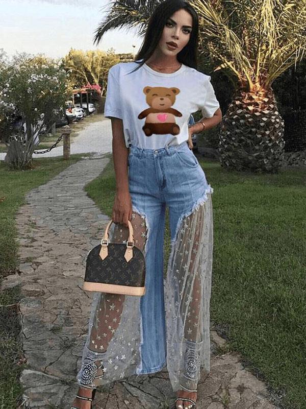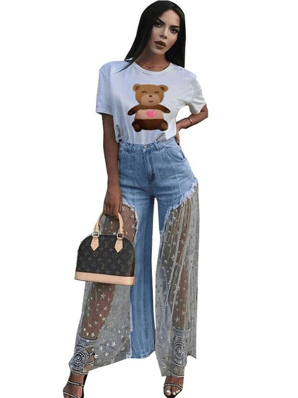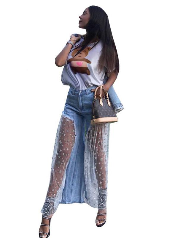 Mesh Stitched Fringed Wide-leg Jean Pants