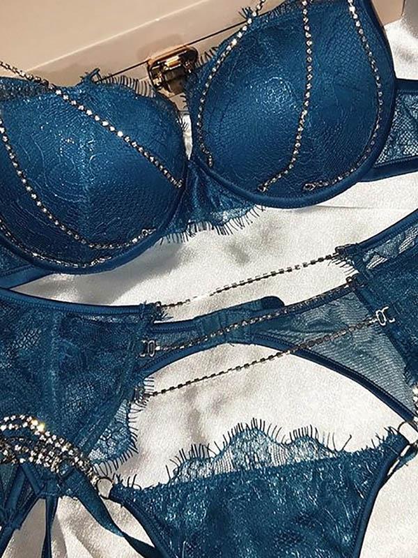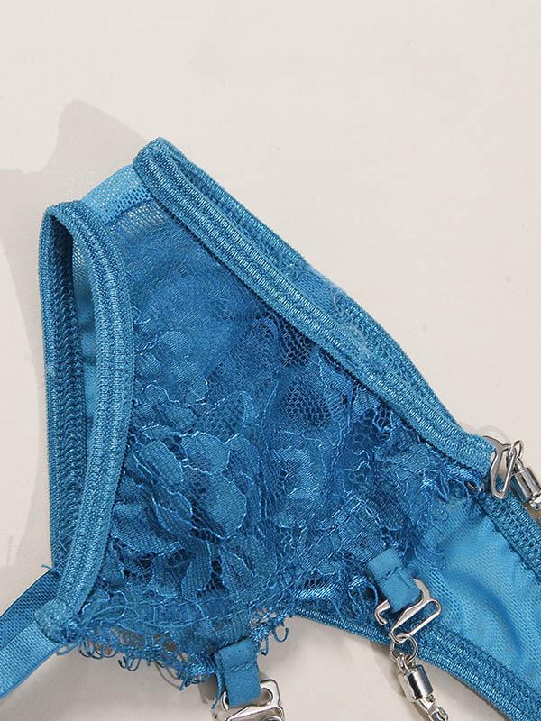 Metal Chain Lace Split Bra Panty Garter Lingerie Set