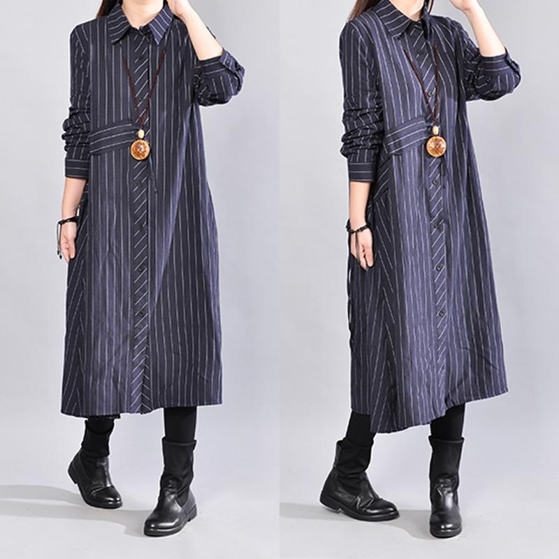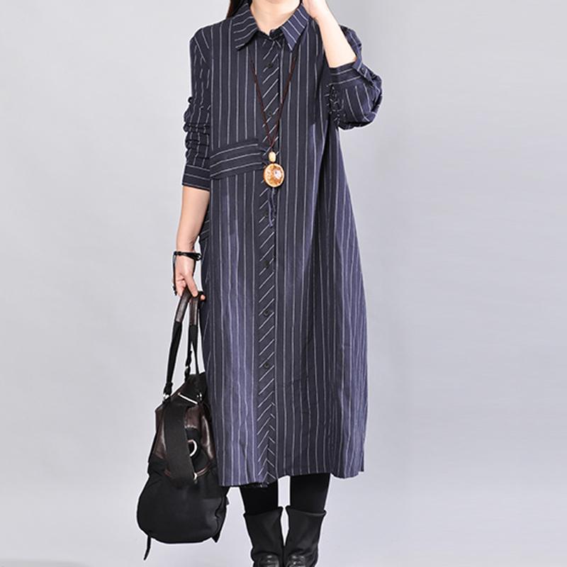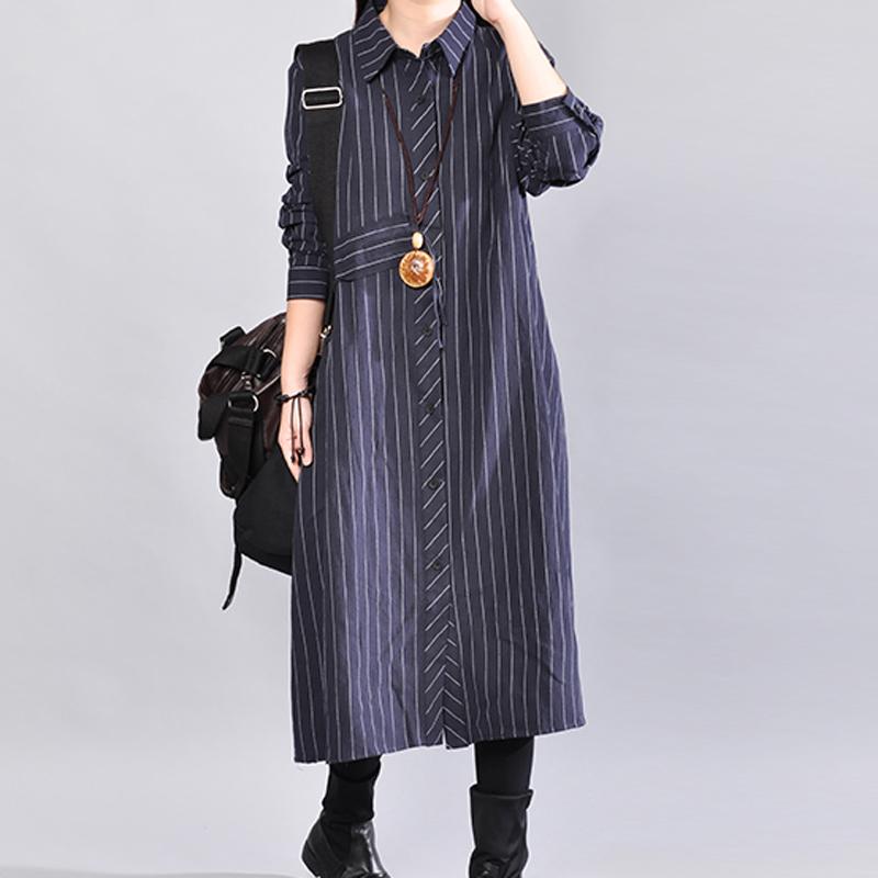 Navy Blue Stripe Cotton Linen Stand Collar Women Long Shirt