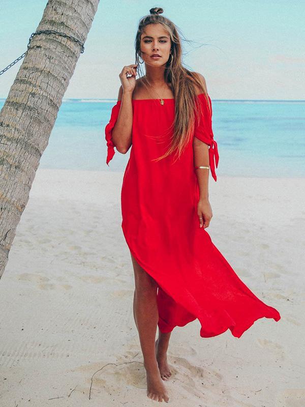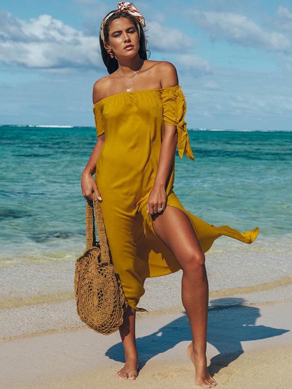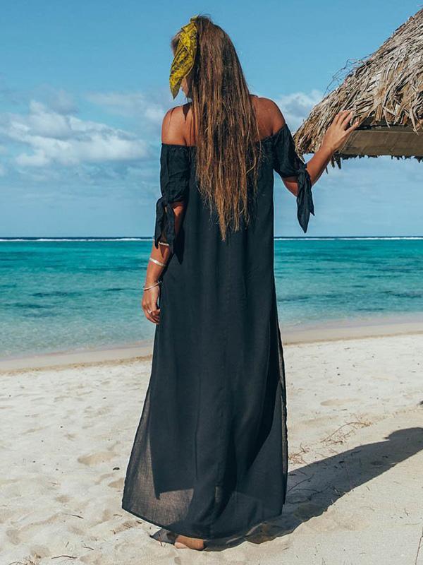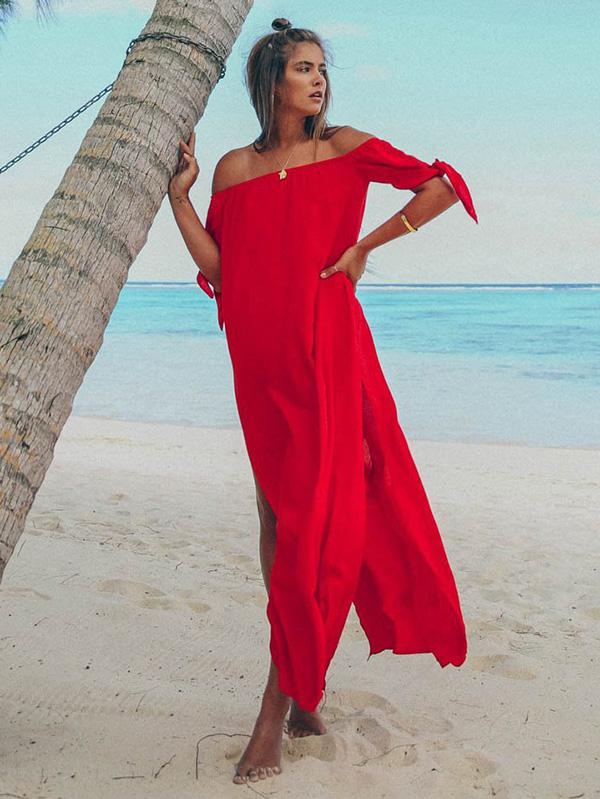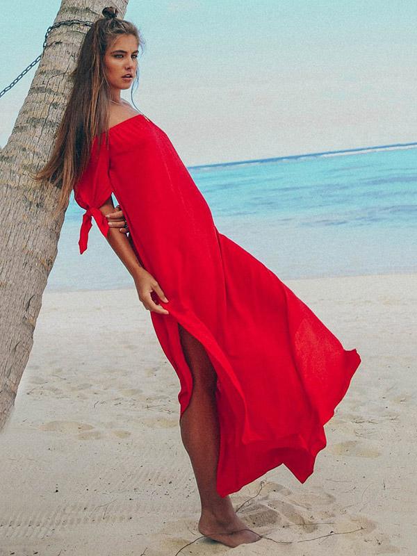 Off Shoulder Split-side Solid Beach Maxi Dresses