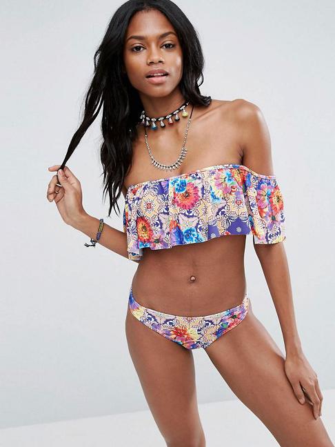 Off-the-shoulder Falbala Printed Bikini Swimwear
