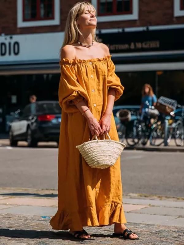 Off-the-shoulder Puff-sleeves Maxi Dress