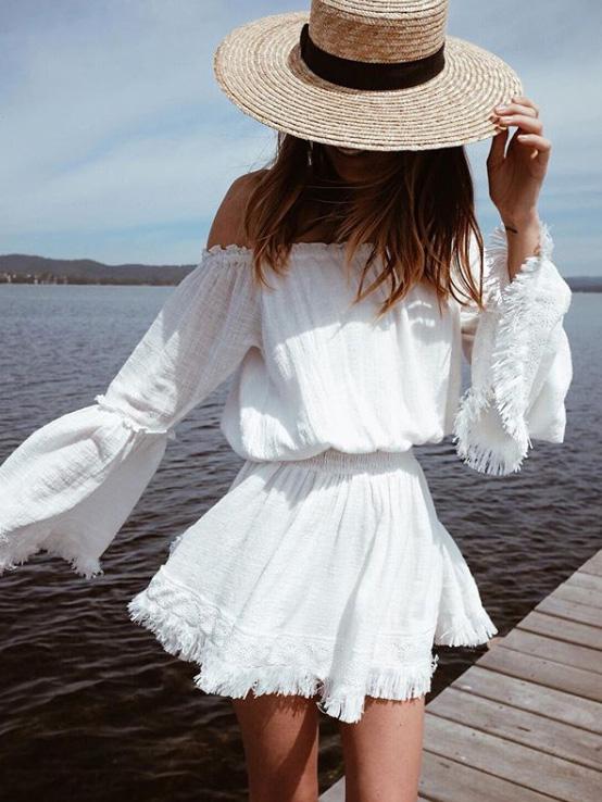 Off-the-shoulder Waisted Flared Sleeve Mini Dress