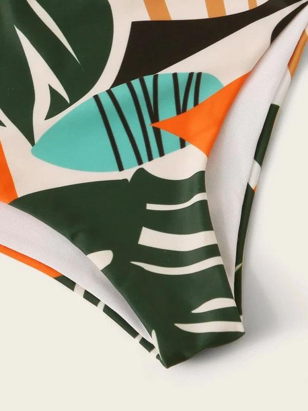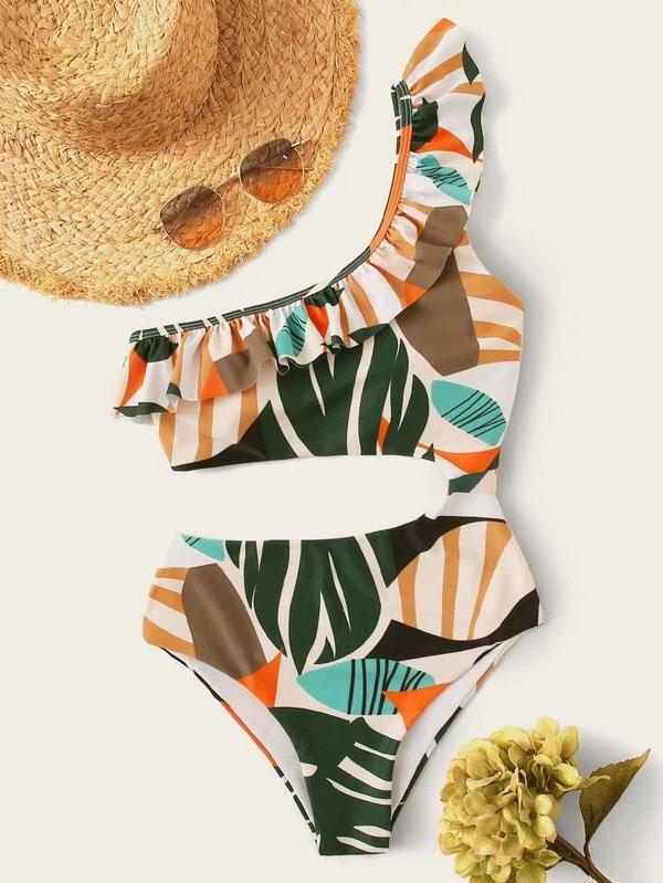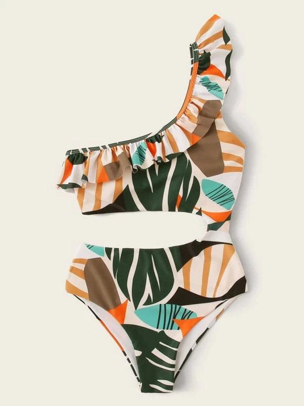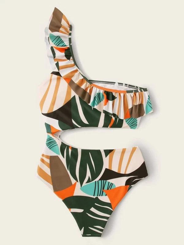 One-Shoulder Falbala Floral-Print One-Piece Swimwear