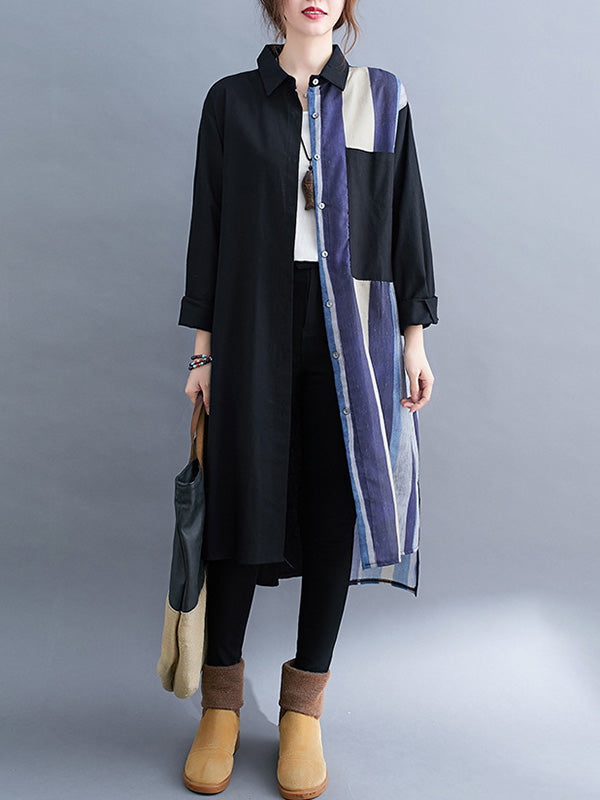 Original Buttoned Contrast Color Split-Joint Long Sleeves Lapel Blouse