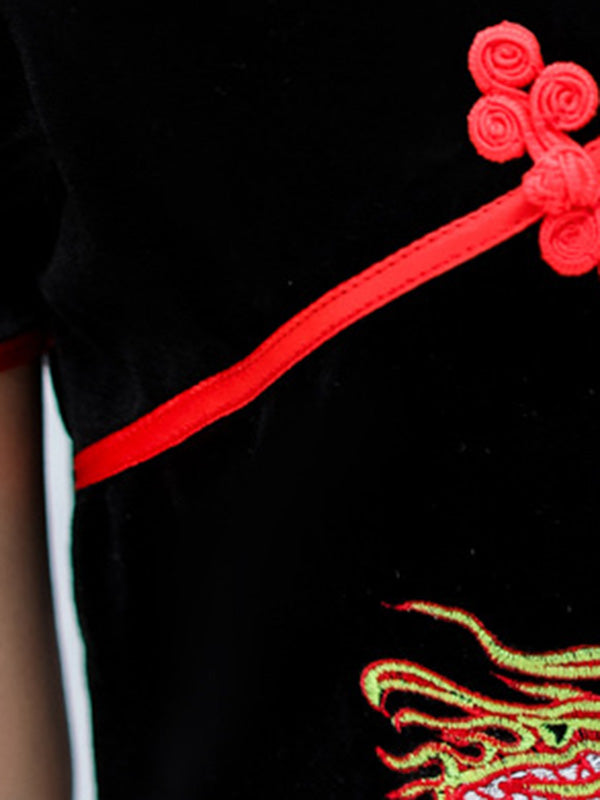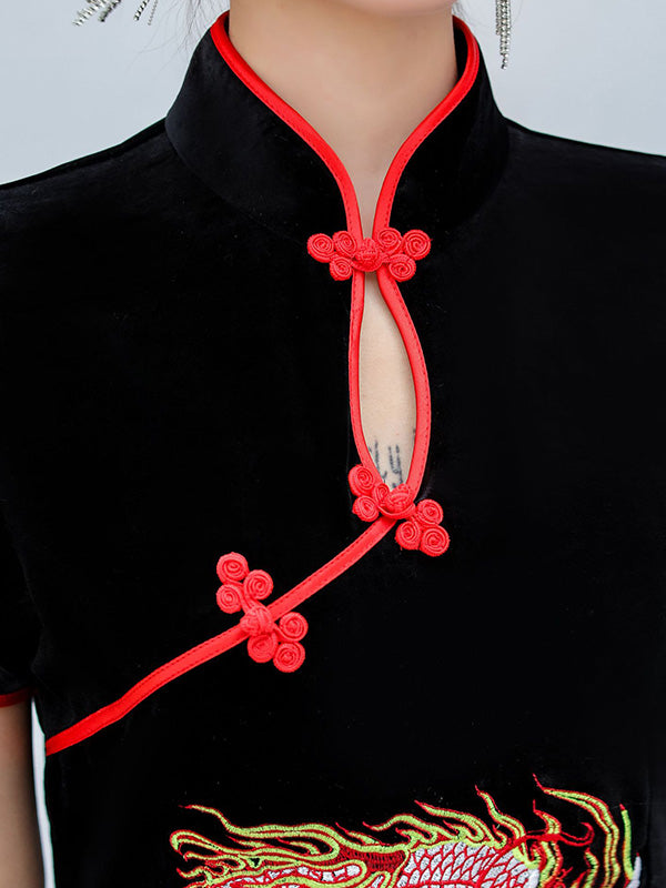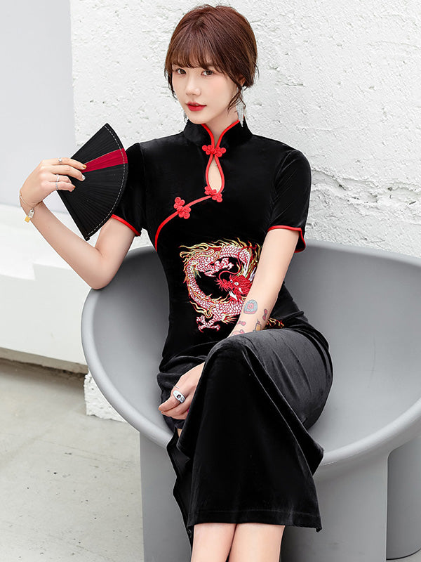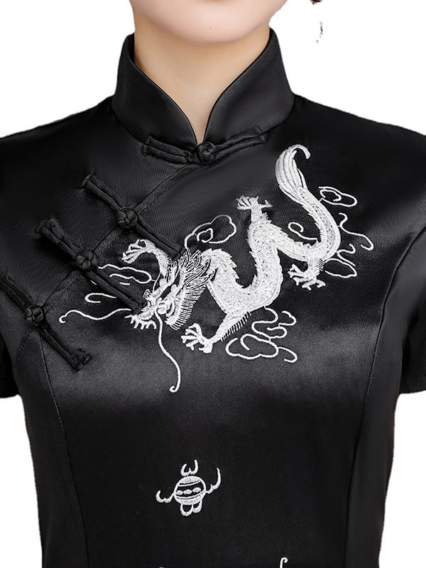 Original Dragon Embroidered Stand Collar Short Sleeves Long Cheongsams