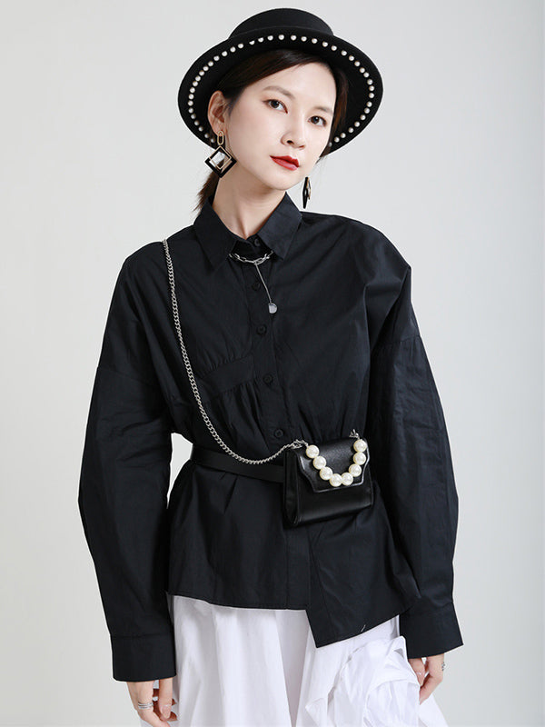 Original Irregular Solid Color Split-Joint Pleated Buttoned Lapel Collar Long Sleeves Blouse