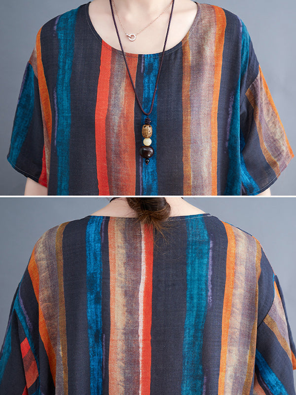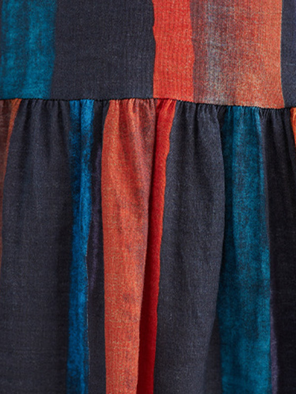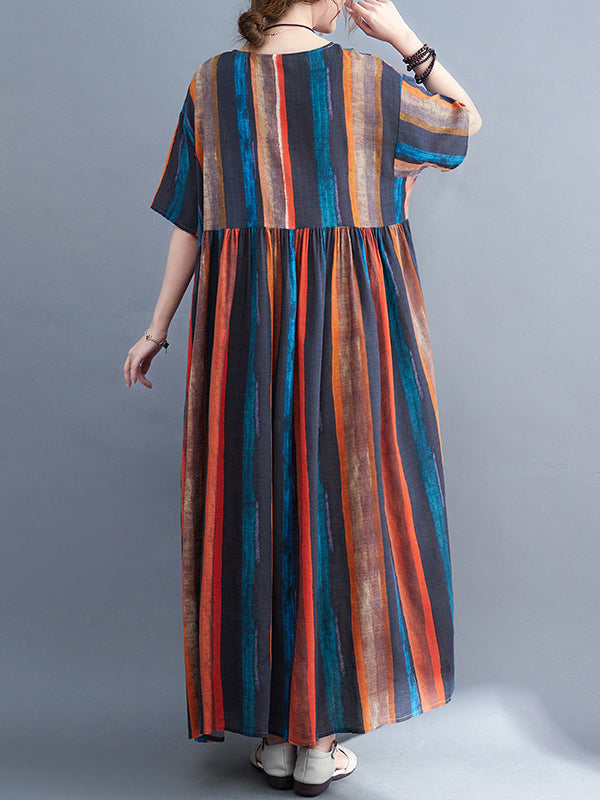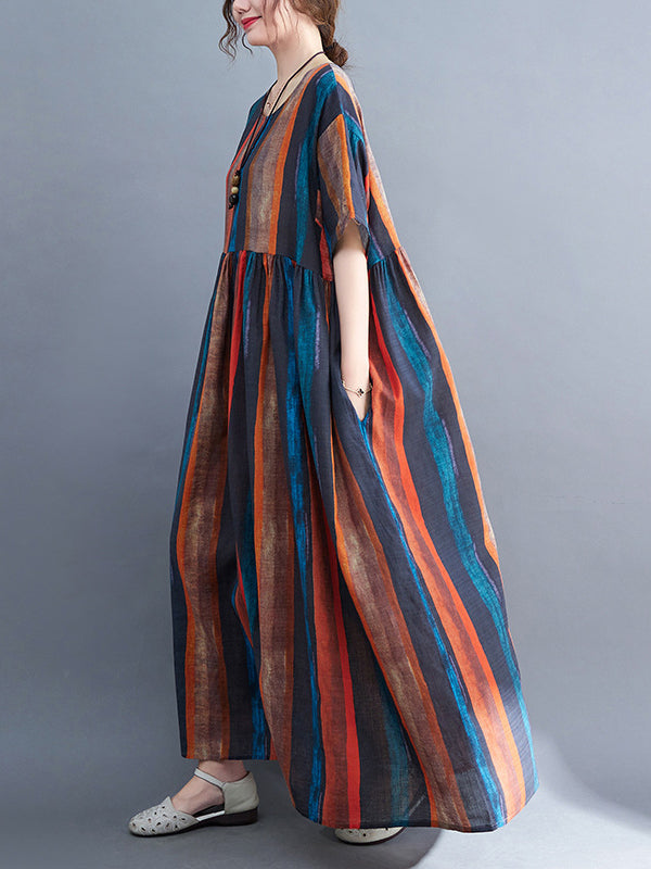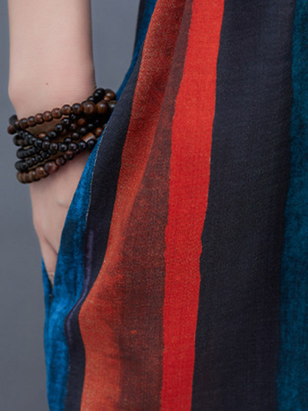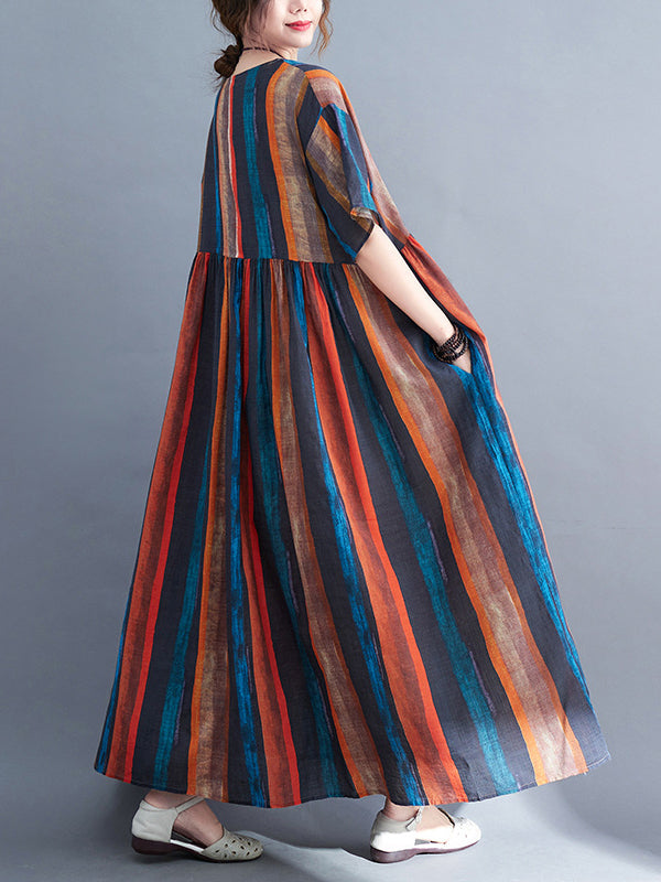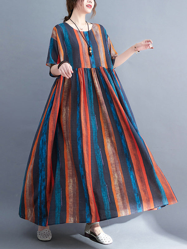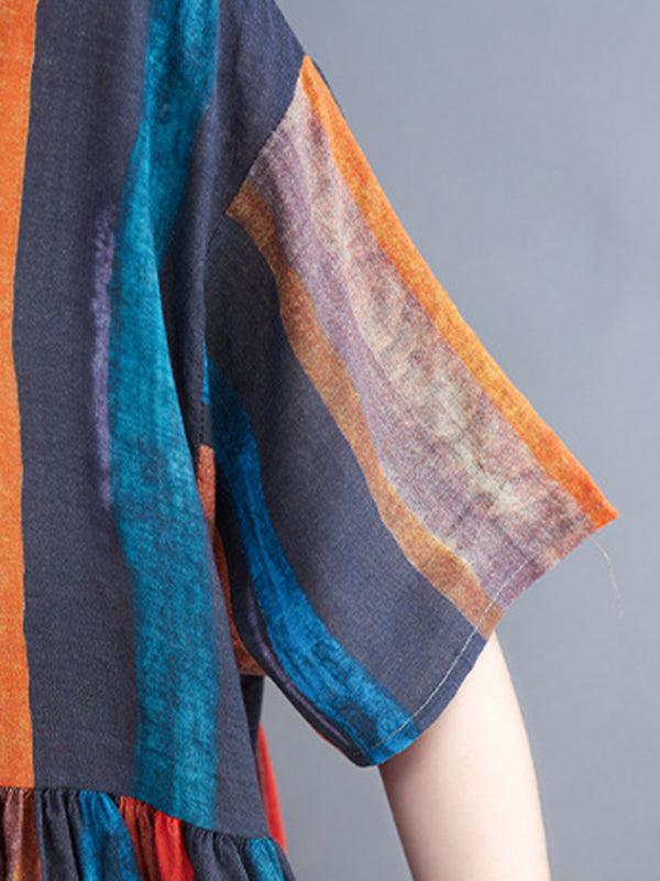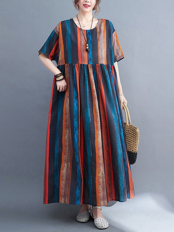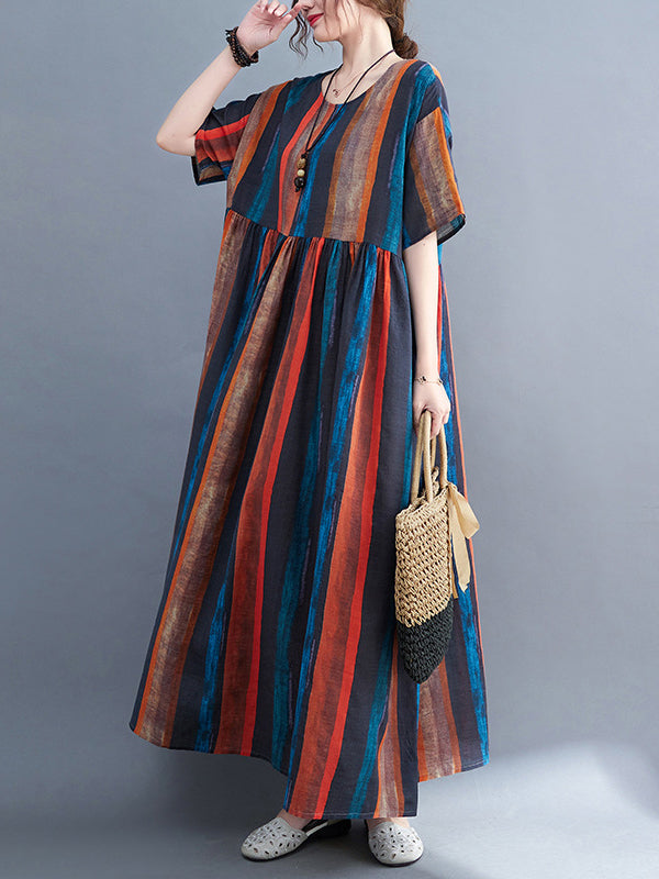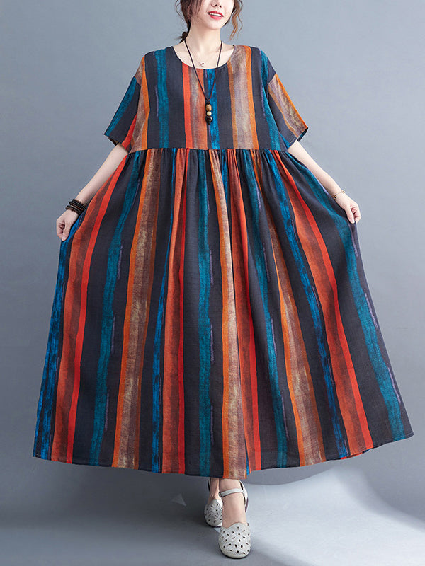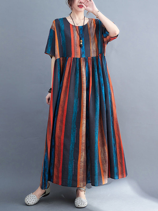 Original Loose Striped Contrast Color Pleated Midi Dress