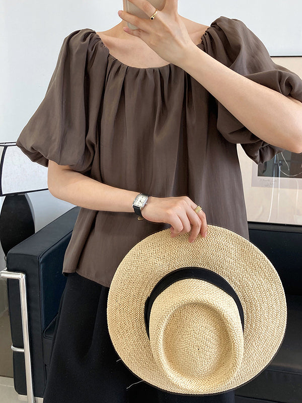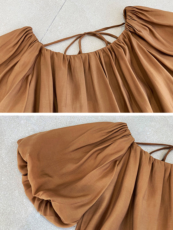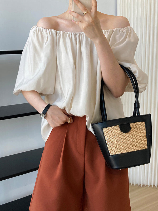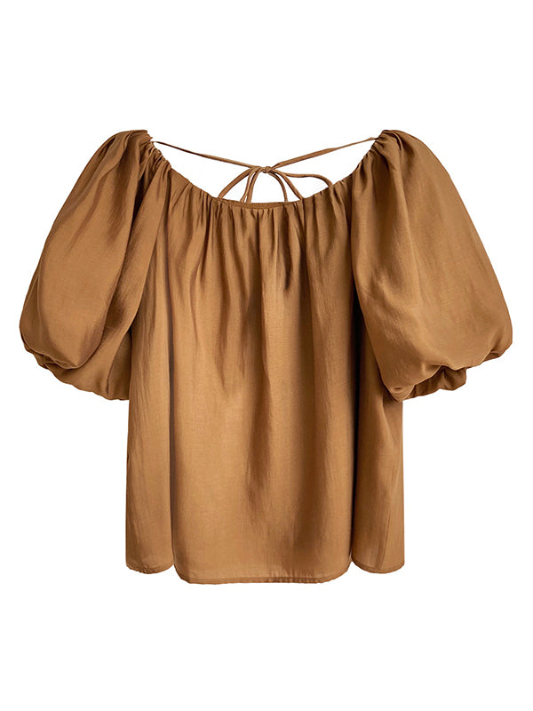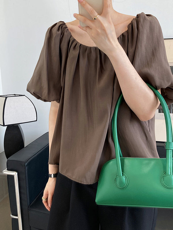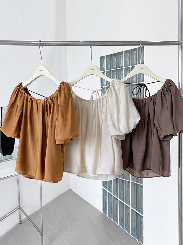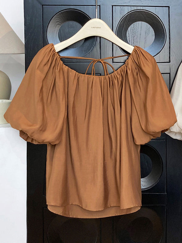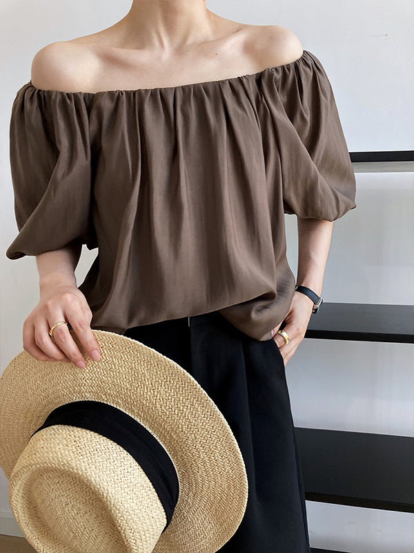 Original Off-The-Shoulder Solid Color Pleated Puff Sleeves Tunic Top