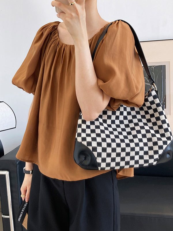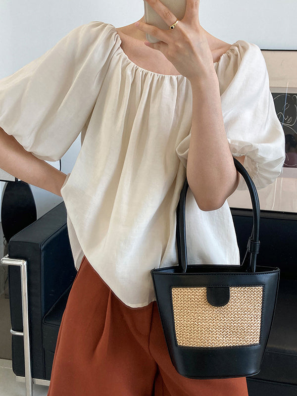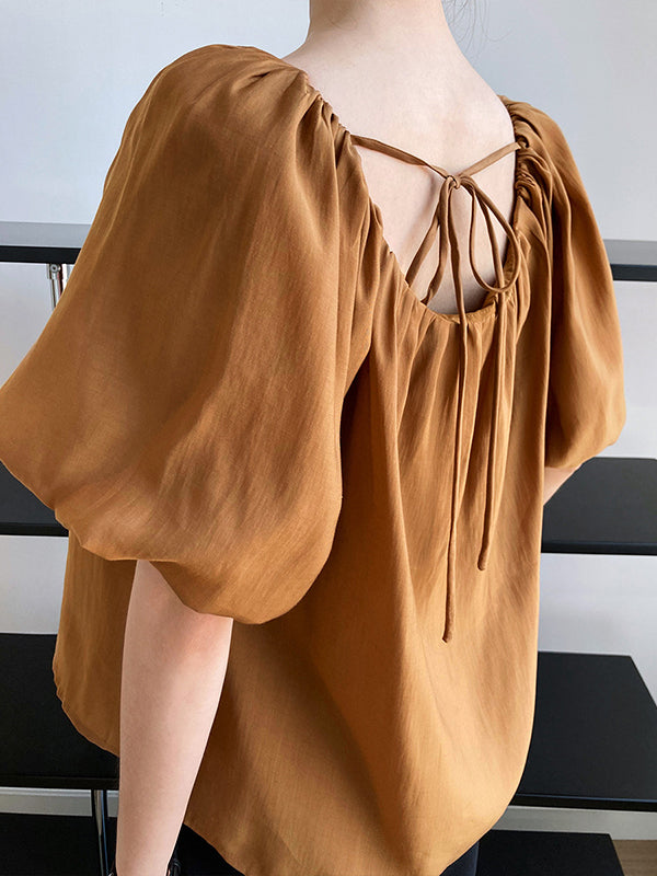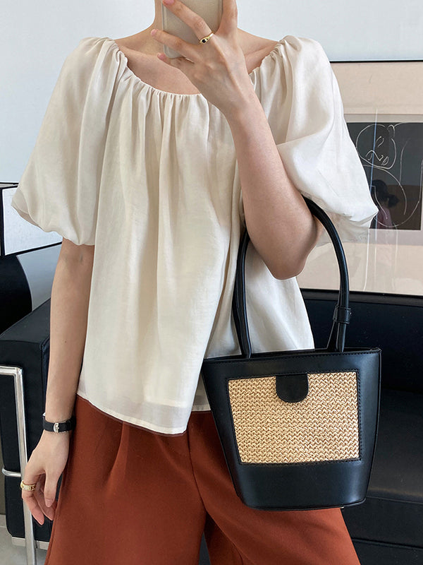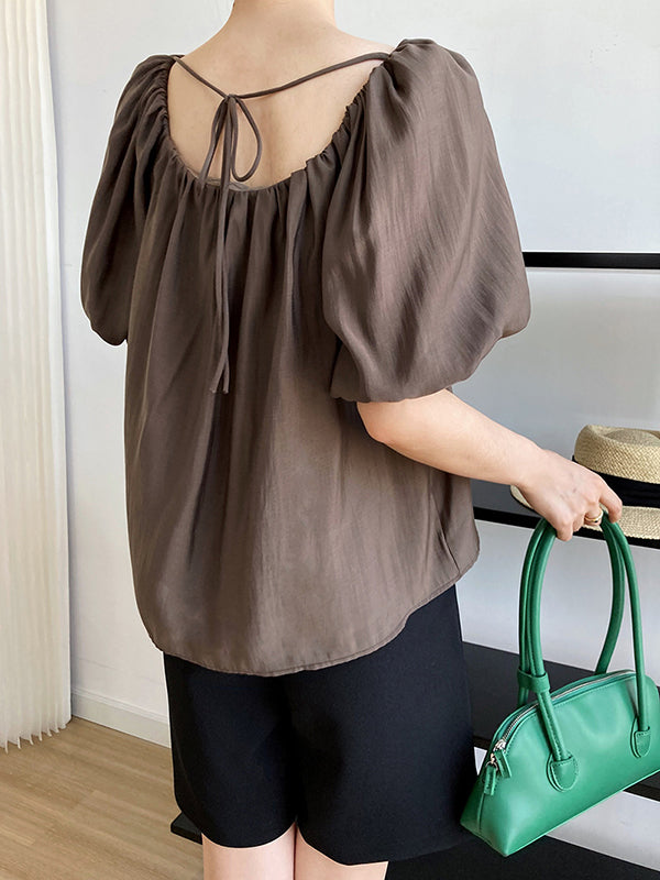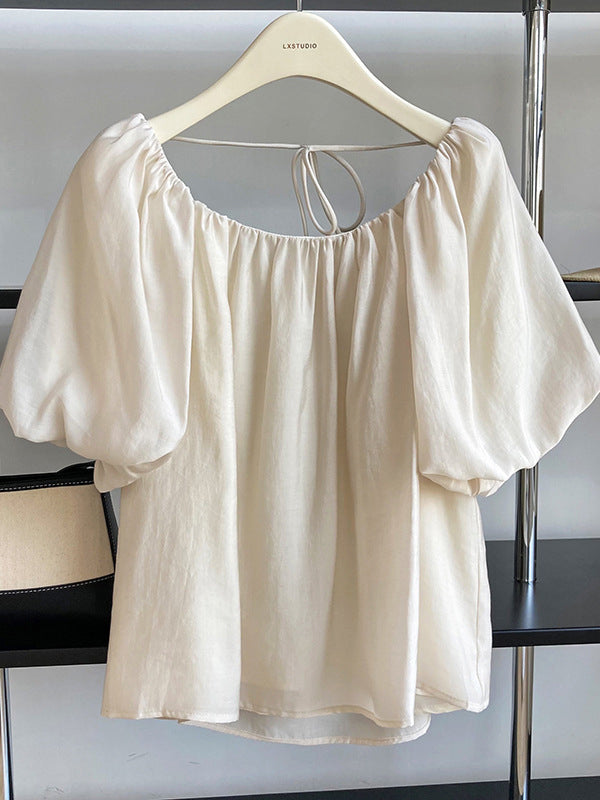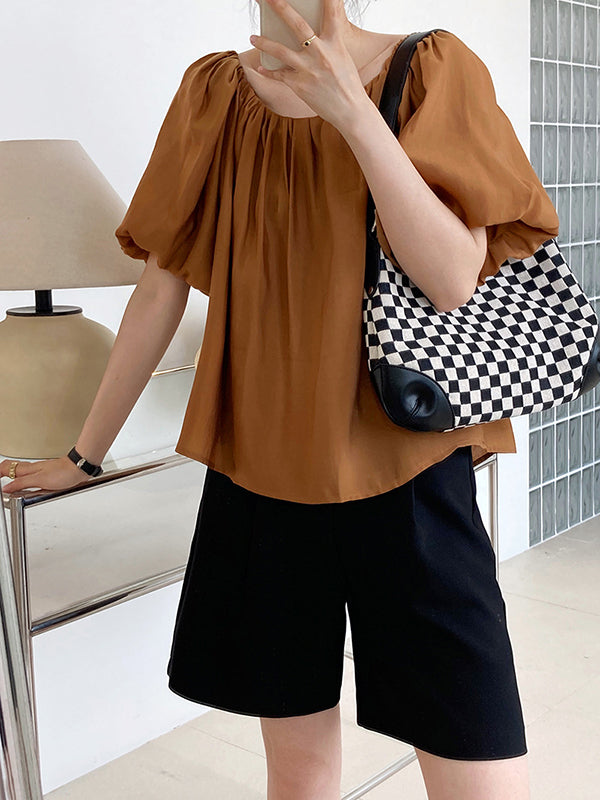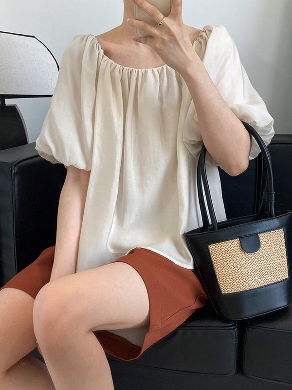 Original Off-The-Shoulder Solid Color Pleated Puff Sleeves Tunic Top