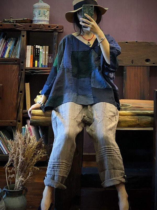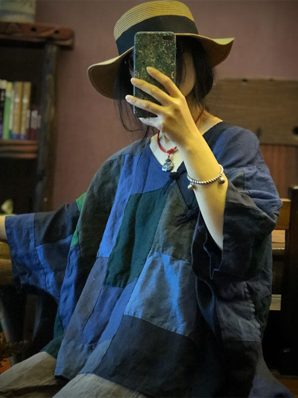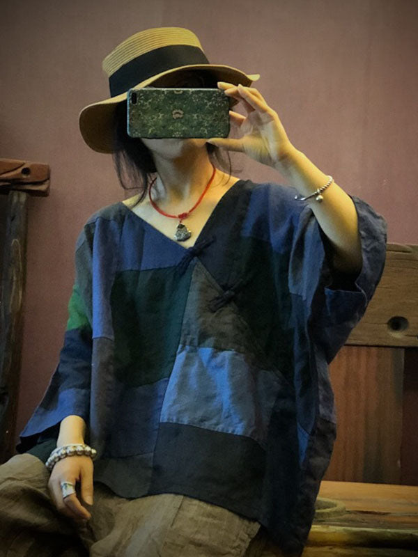 Original Retro Plaid V-neck Linen T-shirt