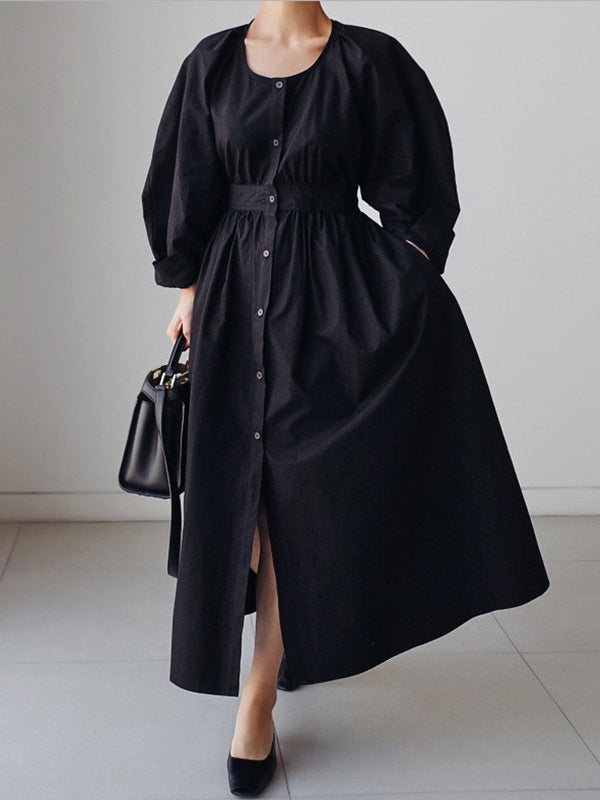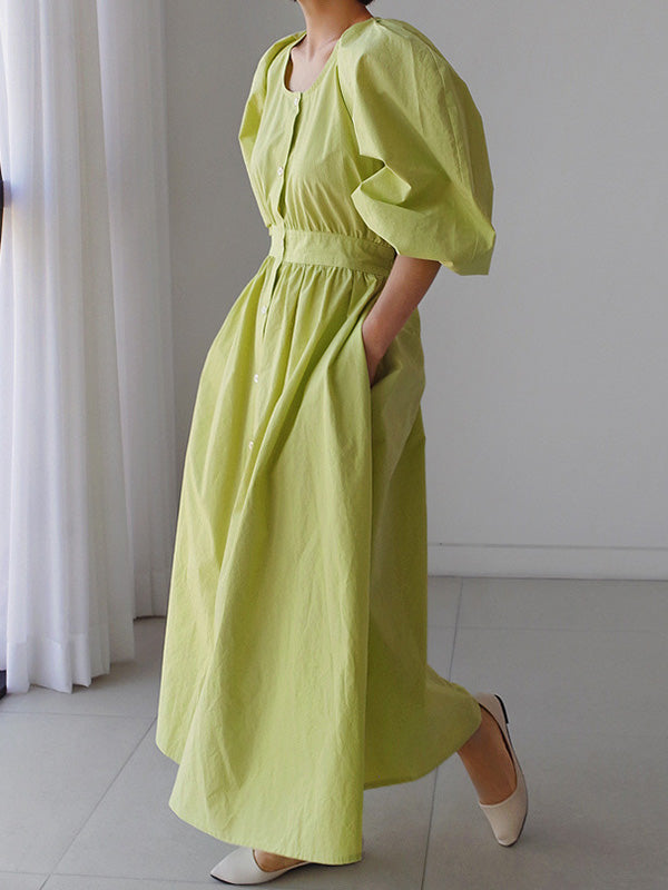 Original Solid Color Pleated Buttoned Round-Neck Bishop Sleeves Midi Dress