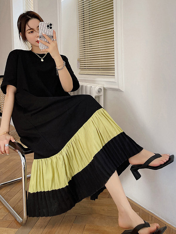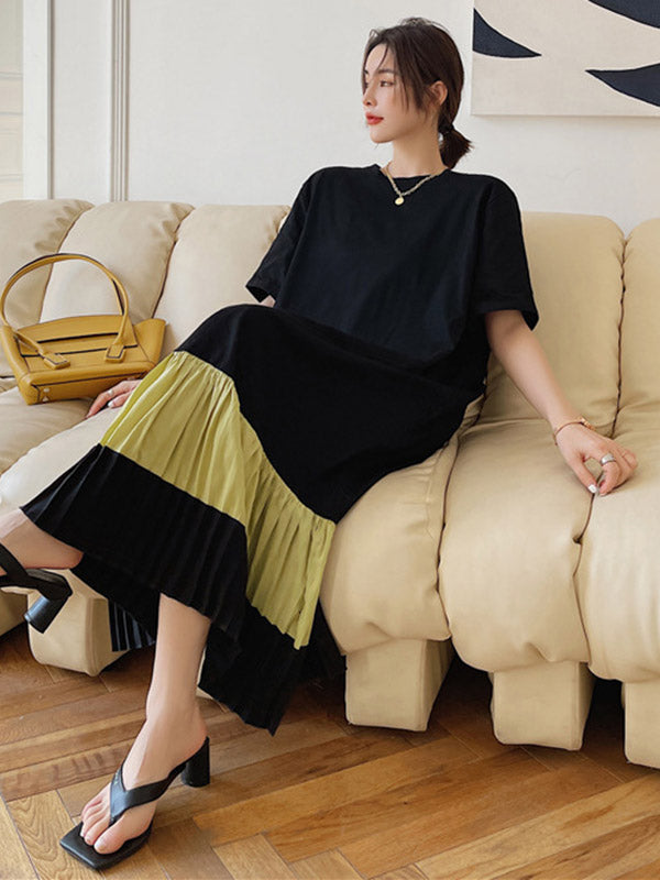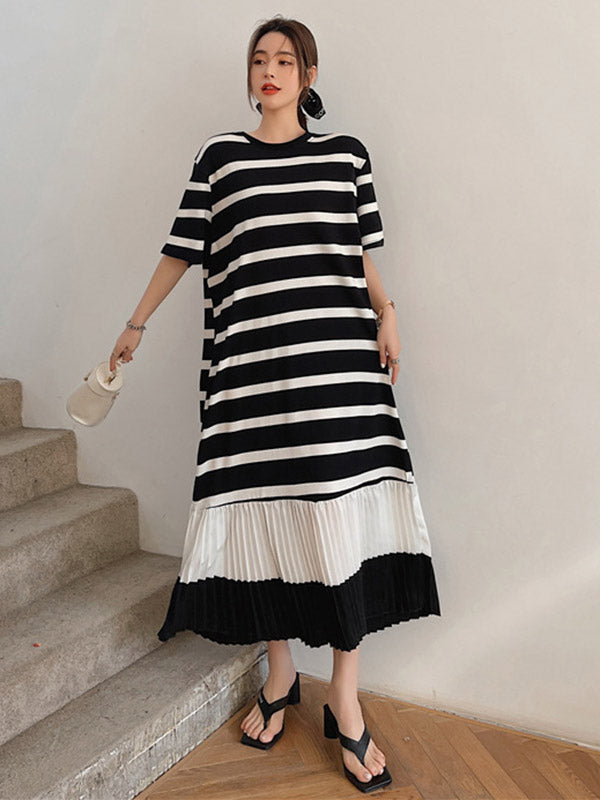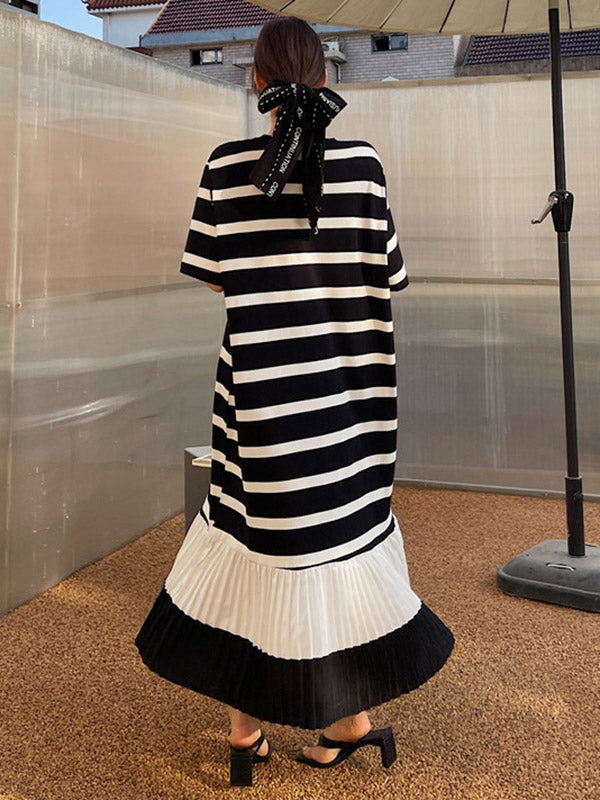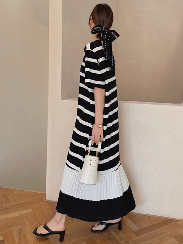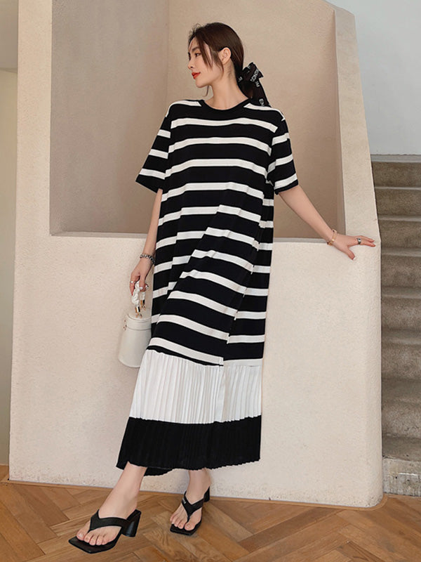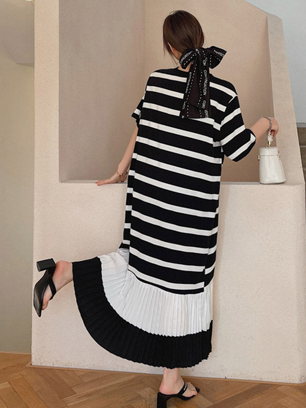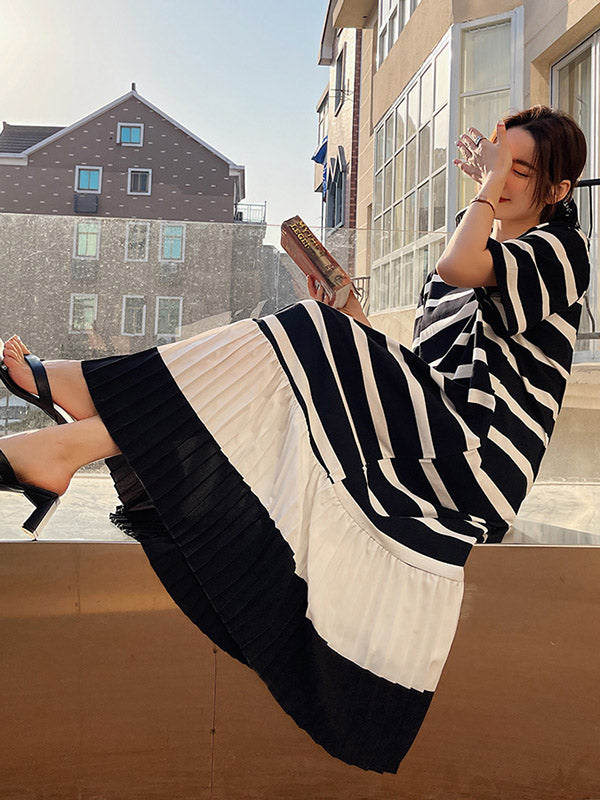 Original Split-Joint Pleats&Stripe Round-Neck Short Sleeve Midi Dress