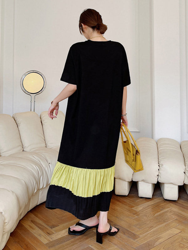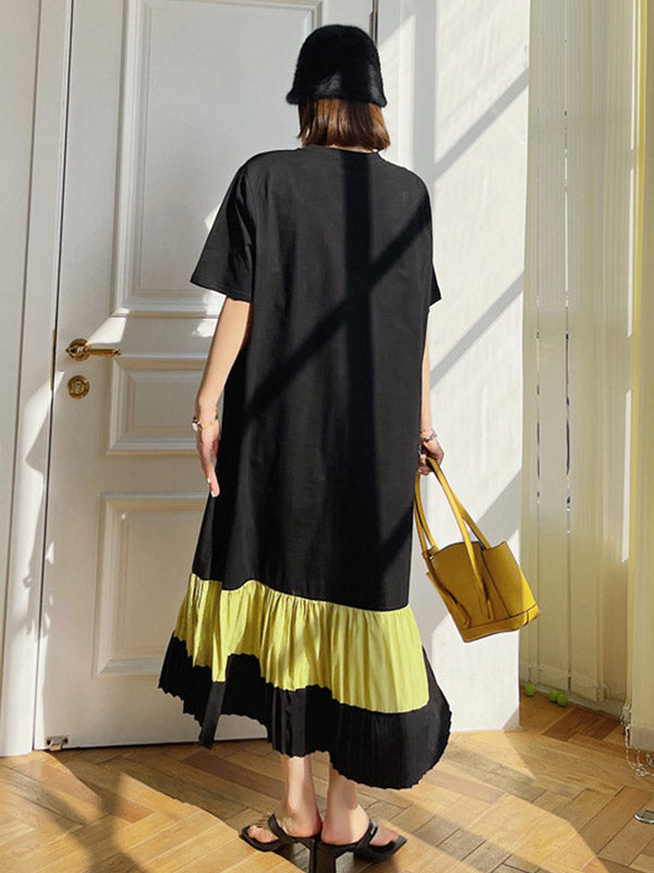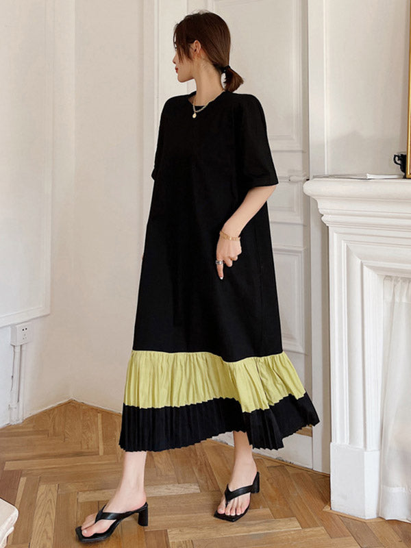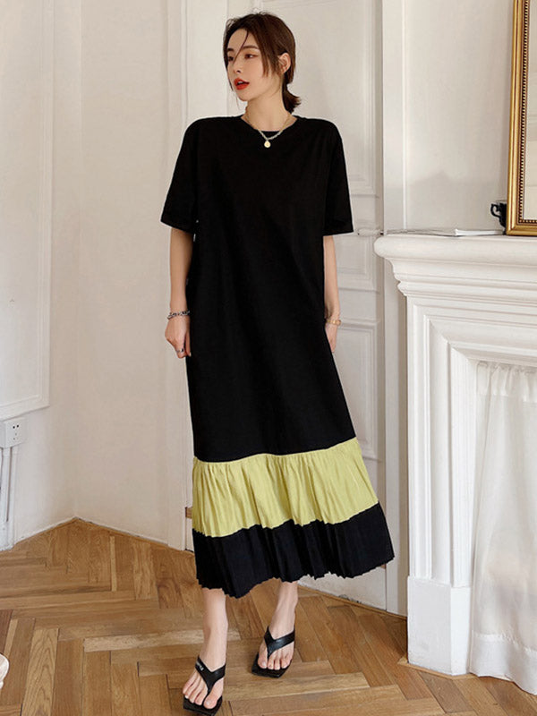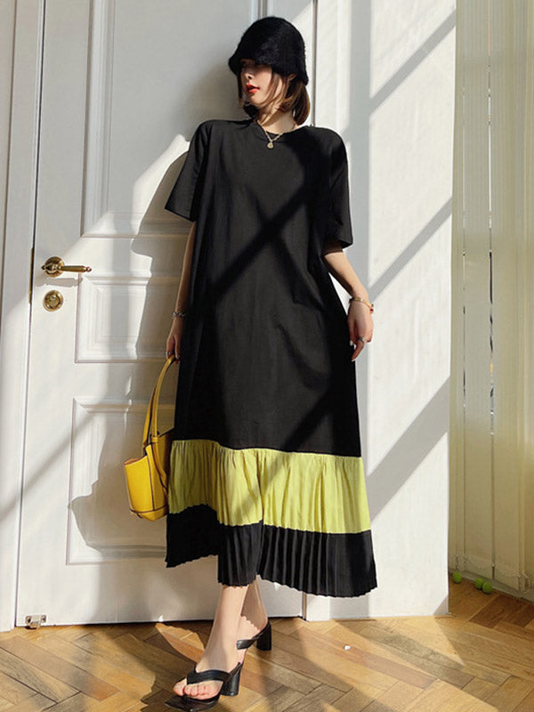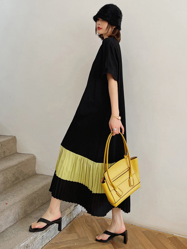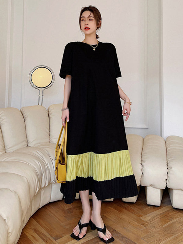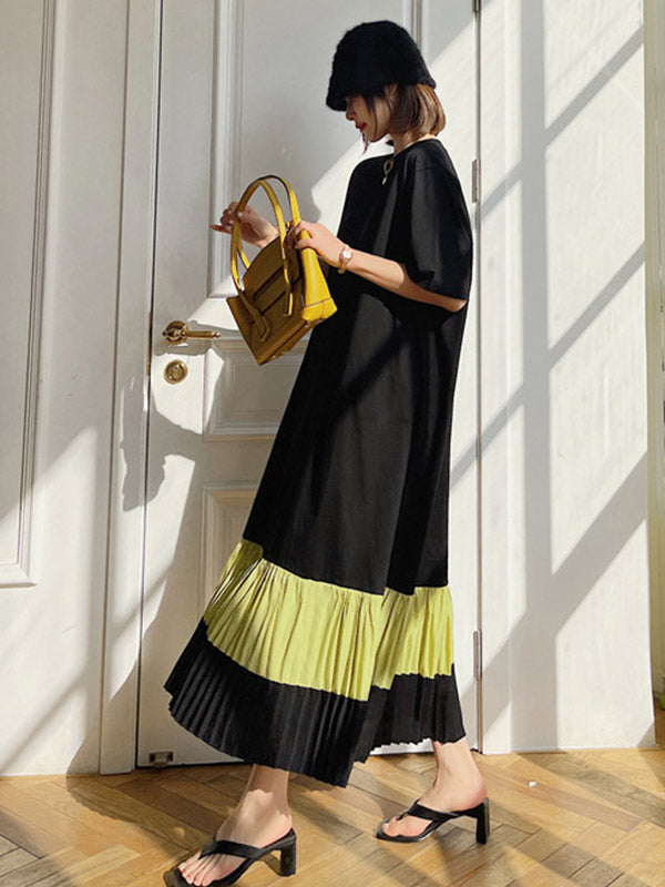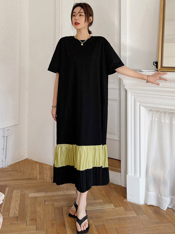 Original Split-Joint Pleats&Stripe Round-Neck Short Sleeve Midi Dress