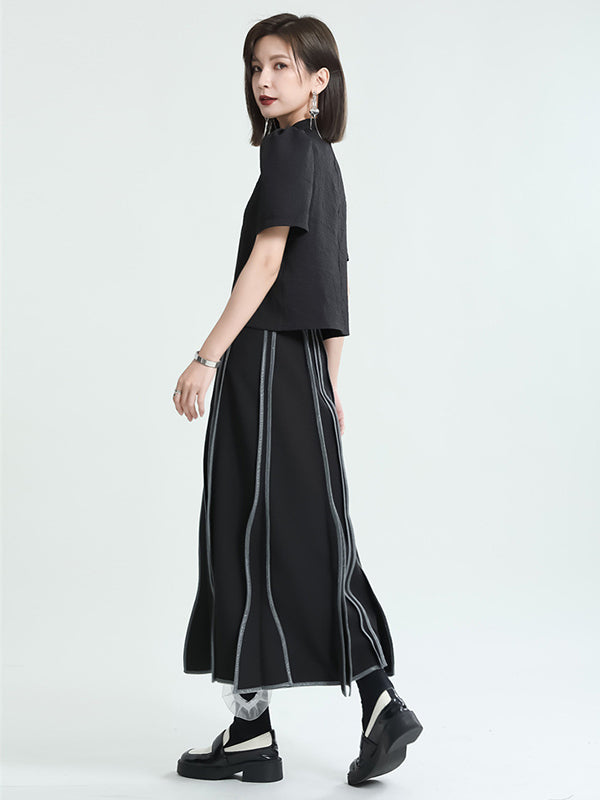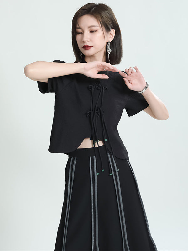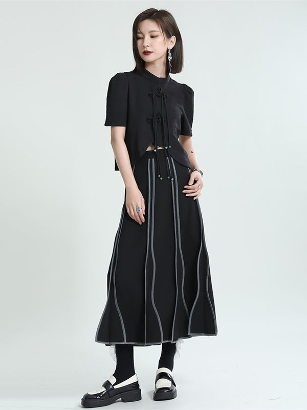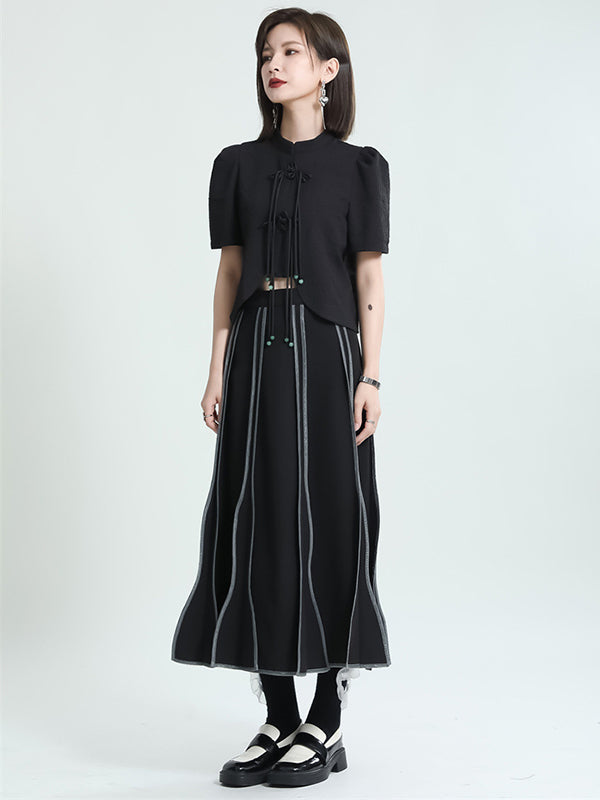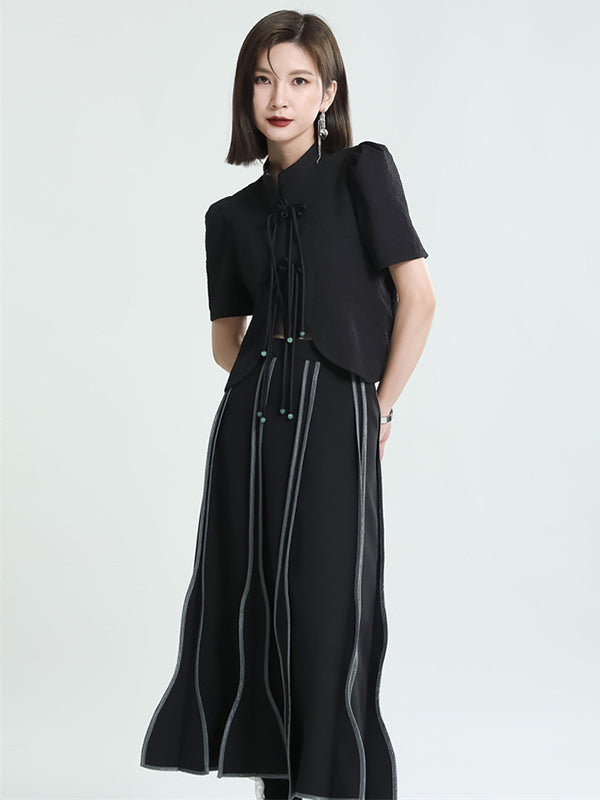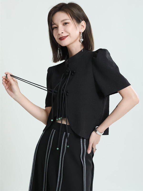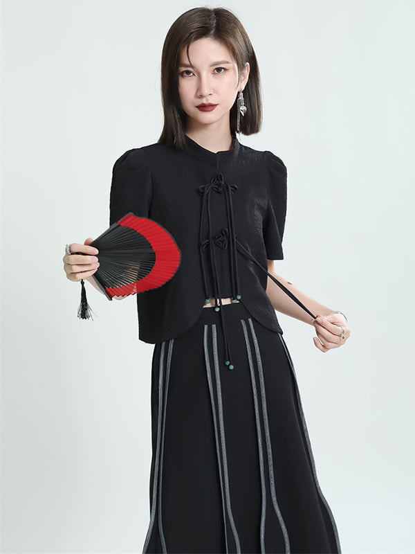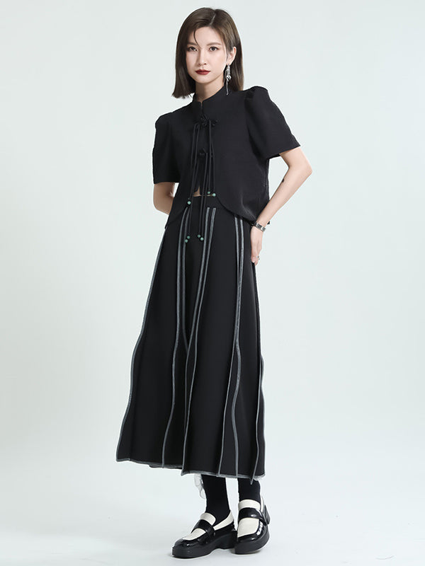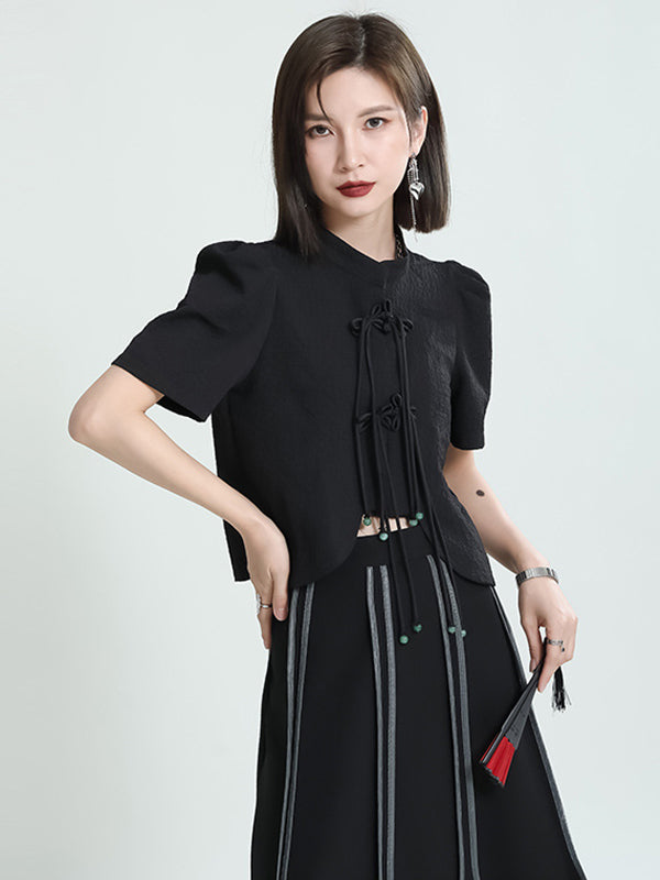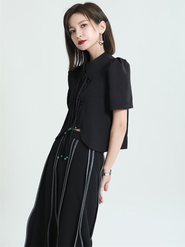 Original Stand Collar Puff Sleeves Black Split-Joint Blouse