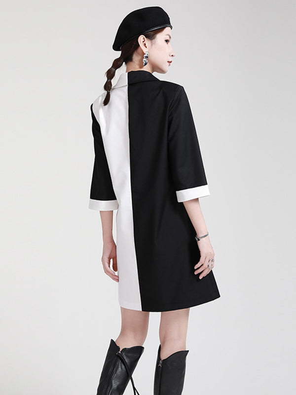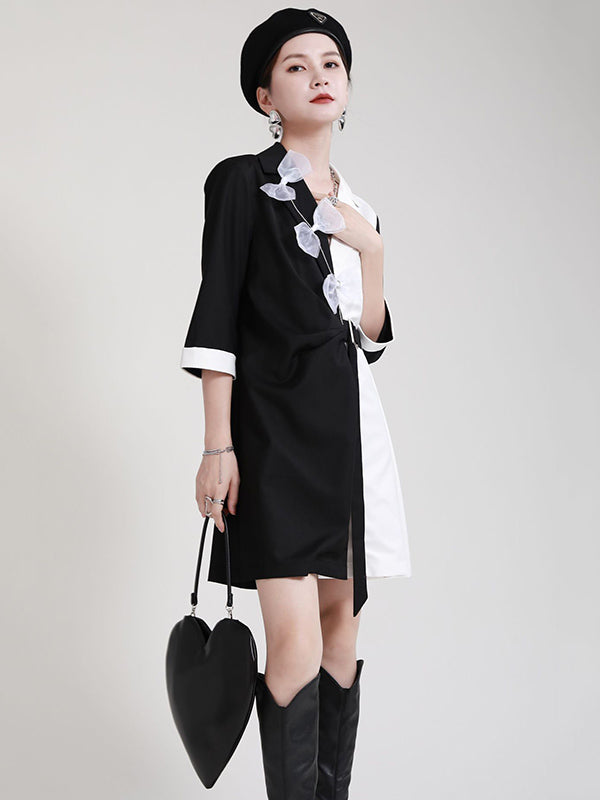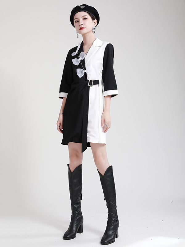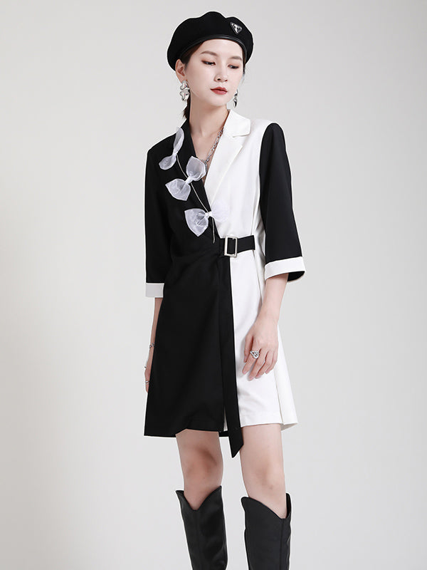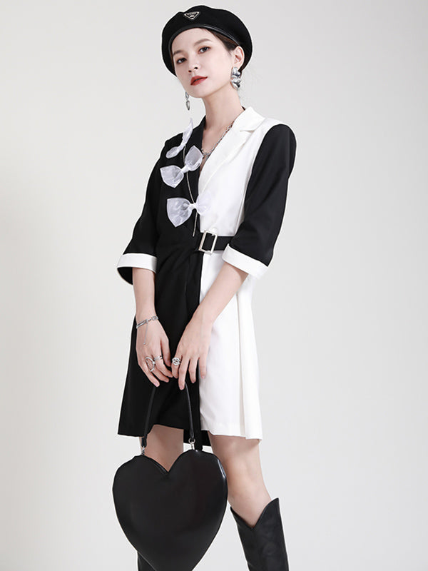 Original Stylish Split-Joint Contrast Color Bow-Embellished Tied A-Line Notched Collar Blazer Dress