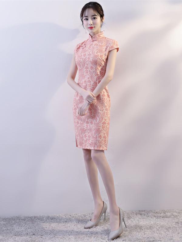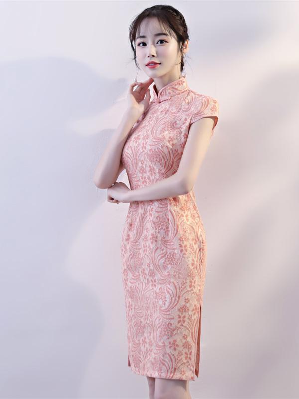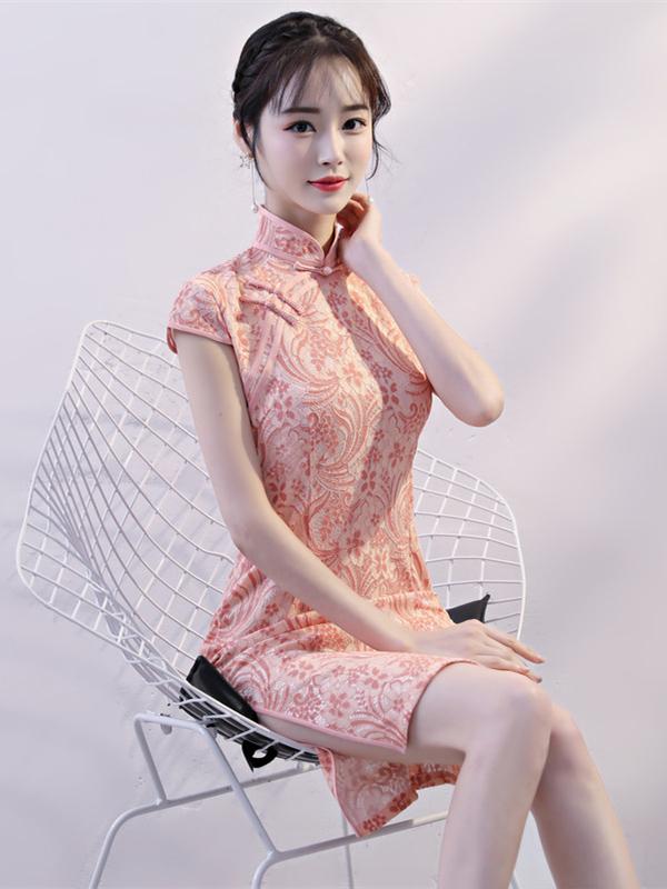 Pink Lace Stand-collar Split-side Short Cheongsam