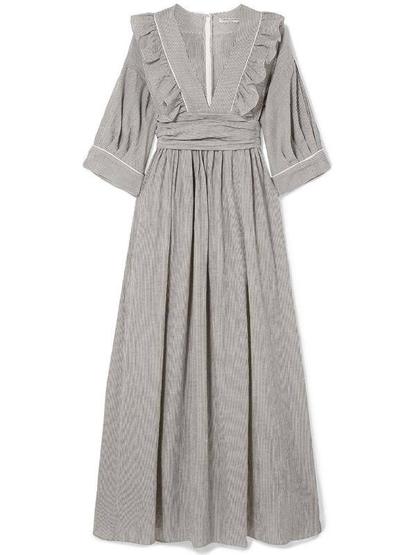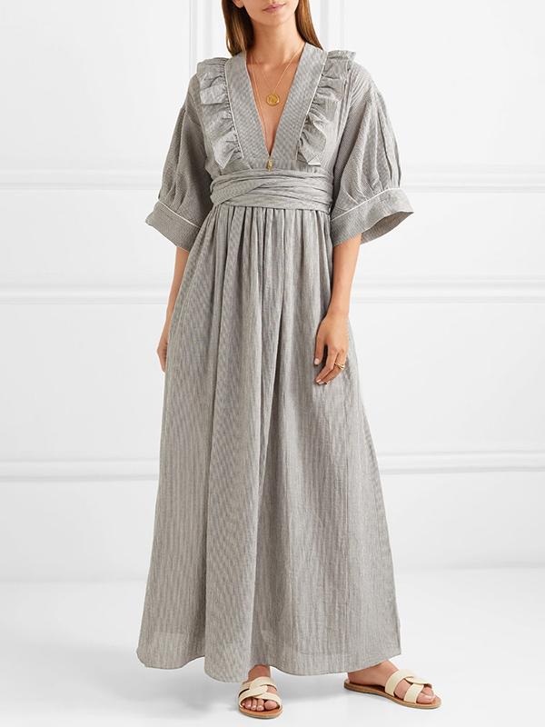 Pinstripe V-neck Half Sleeves Maxi Dress