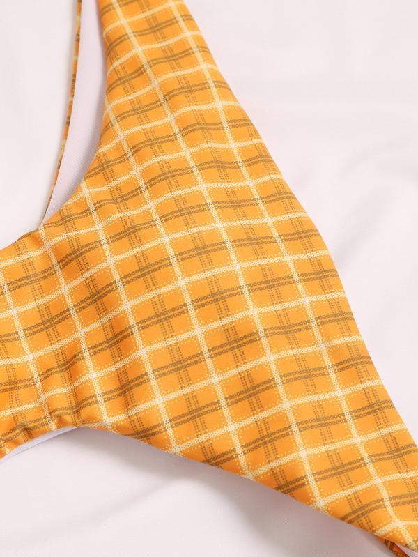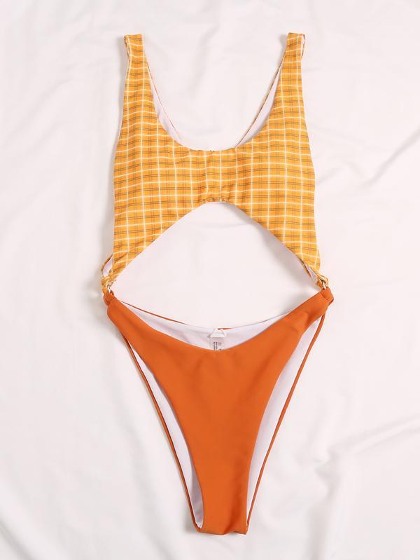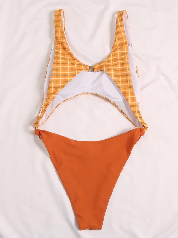 Plaid Printed Split-Joint Hollow One-Piece Swimwear