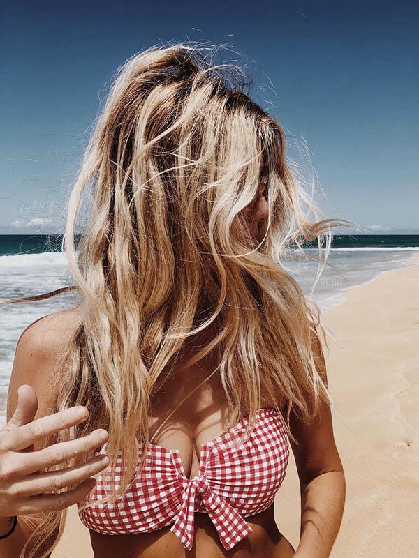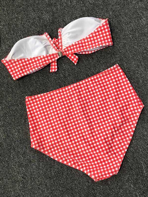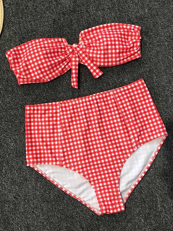 Plunge Neck Plaid Top With High Cut Bikini Set