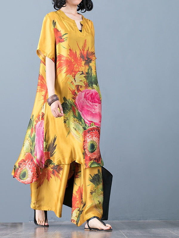 PLUS SIZE LOOSE PRINT SILK LONG SHIRT&WIDE-LEG PANTS SUITS