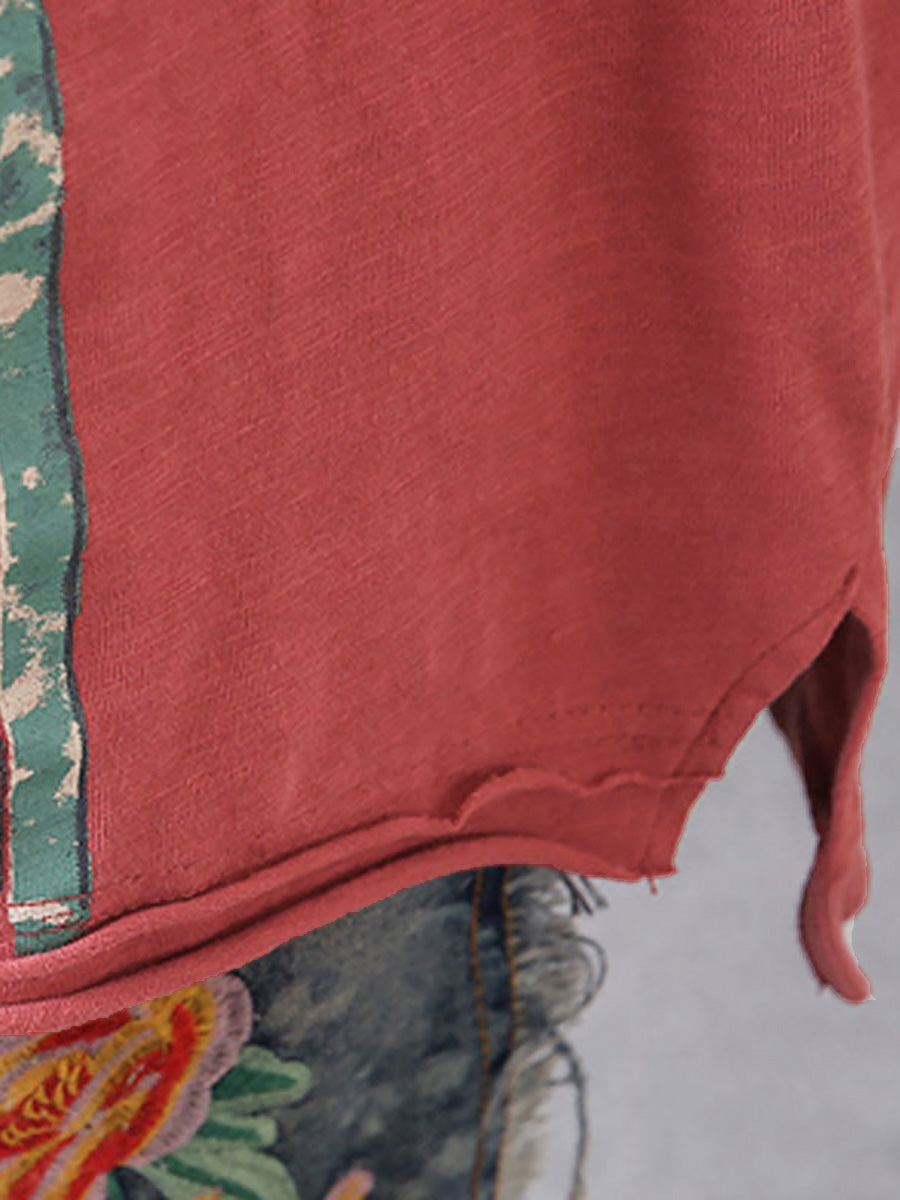 - Loose cotton sunflower printed red top. has a round neck. three quarter sleeve. you'll enjoy wearing across spring. summer. autumn.