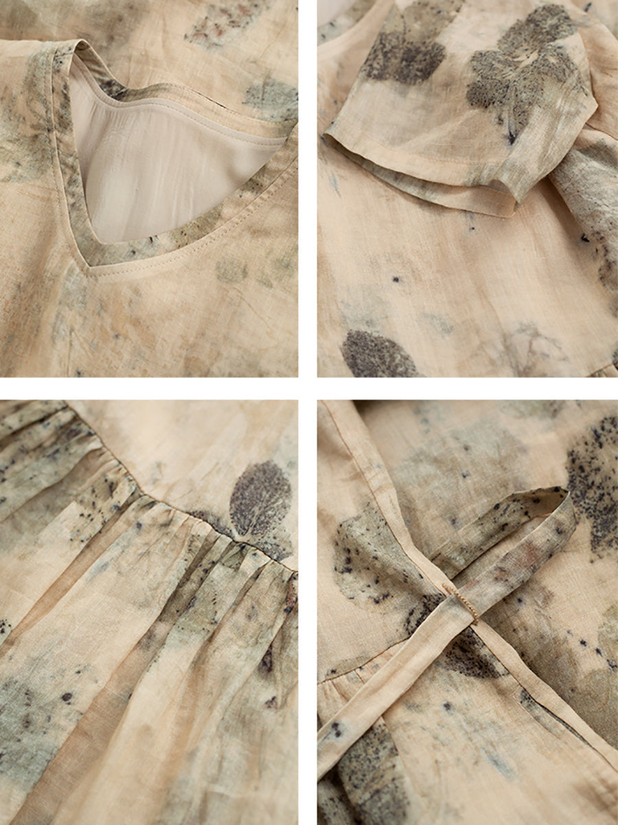 Plus Size Women Artsy Ink-Print Drawstring Ramie Dress