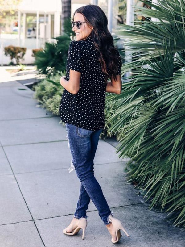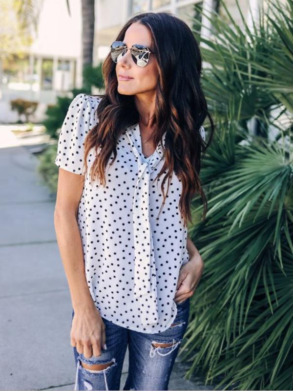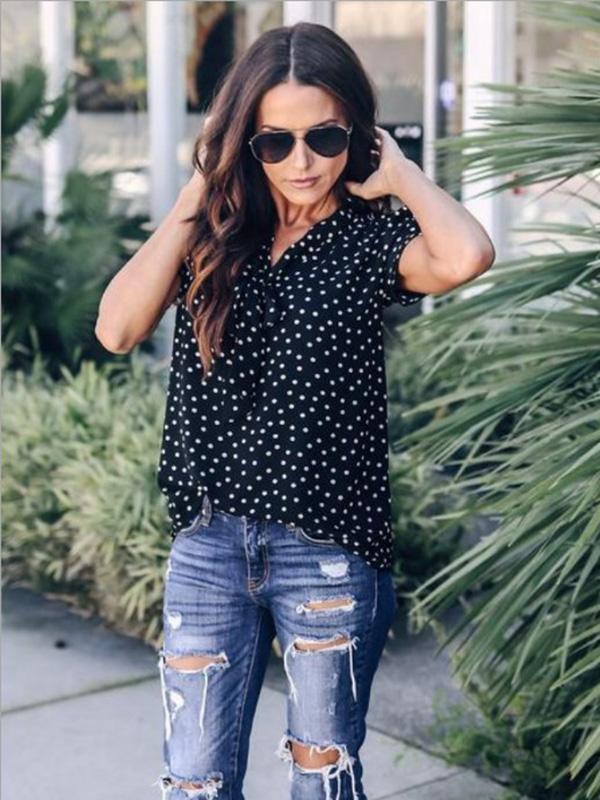 Polka Dot Loose Chiffon V neck Short Sleeve T-shirt