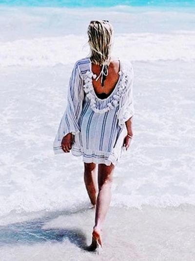 Pompoms Backless Long Sleeves Cover-up Mini Dresses
