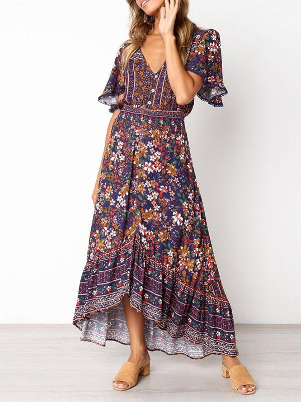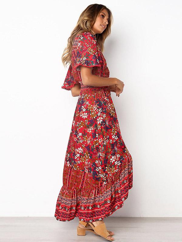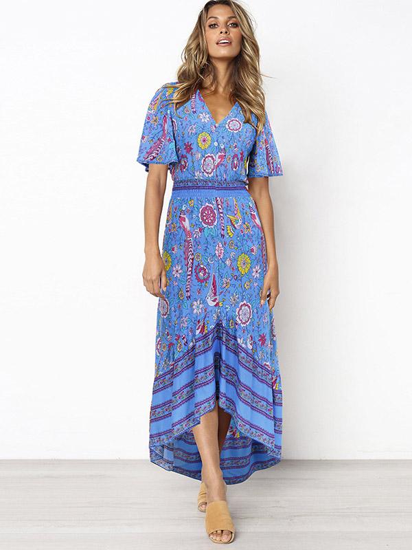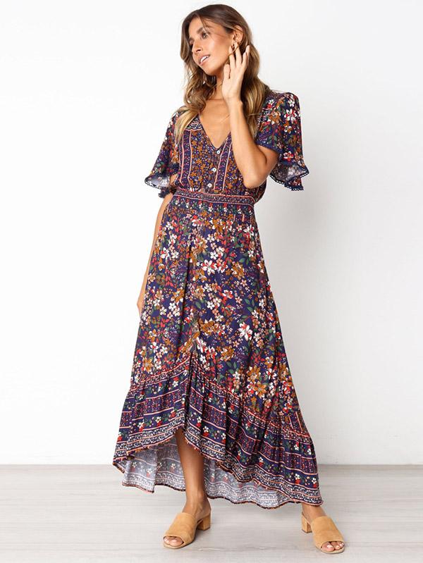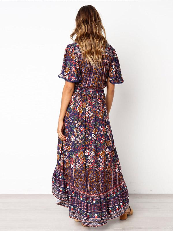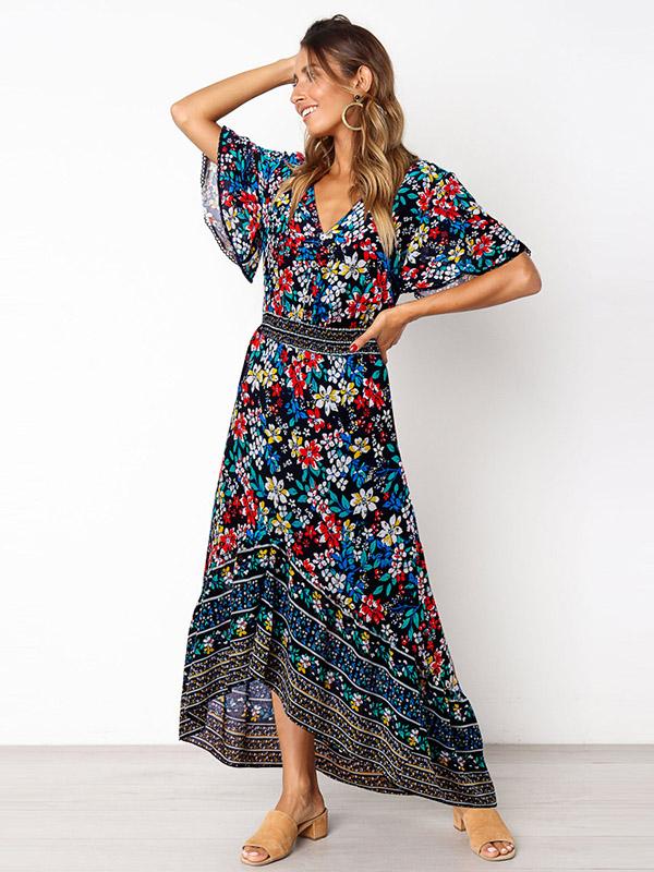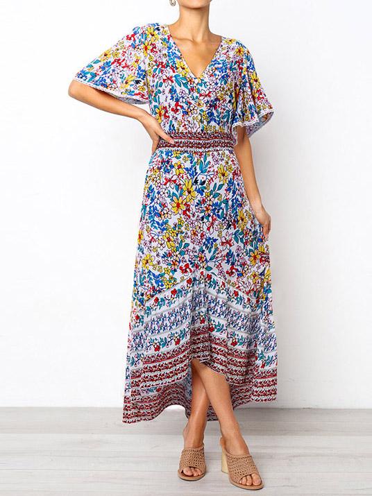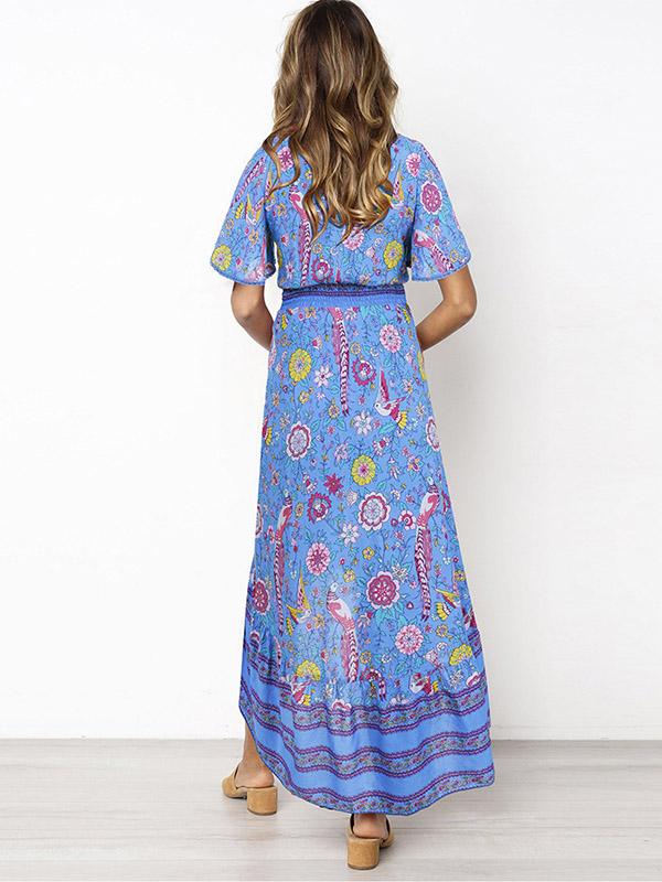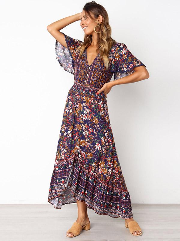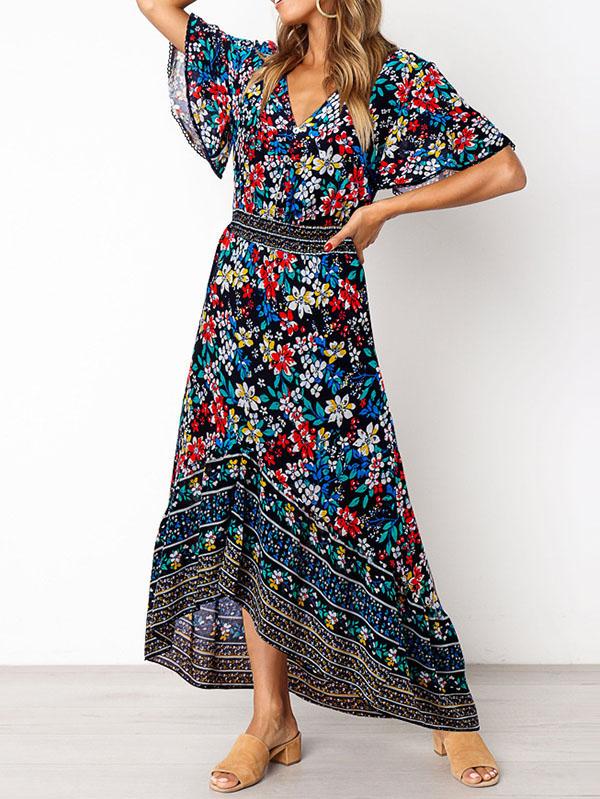 Printed Flared Sleeve Bohemian Flowers Maxi Dress