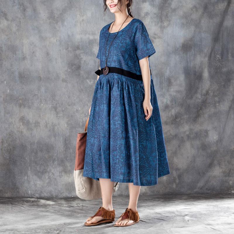 Printed Lacing Short Sleeve Dresses Blue Pleated Dress
