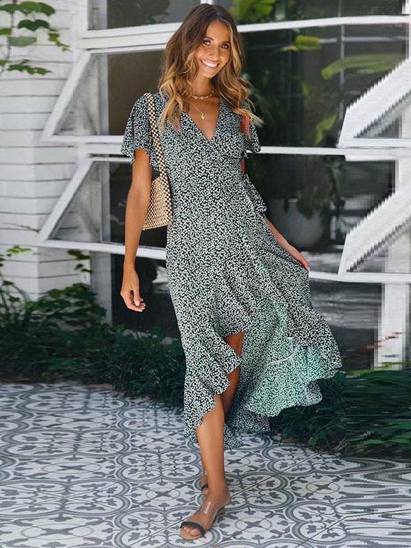 Printed Short Sleeves Split-front V-neck Maxi Dresses