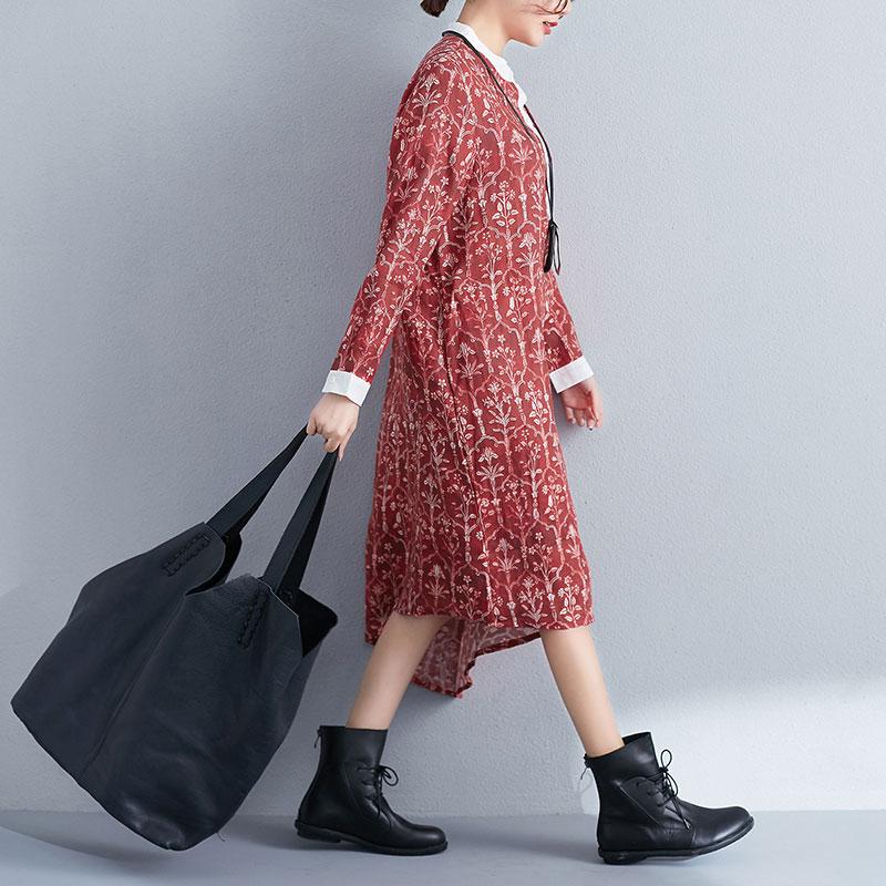 Printed Stand Collar Autumn Women Long Sleeve Red Dress