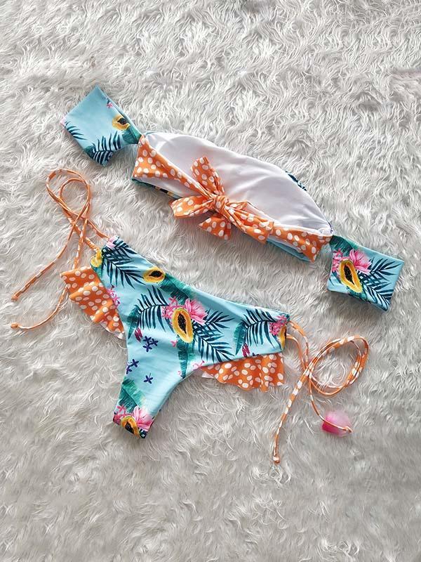 Printed Strapless Lace Up Bikinis Swimwear
