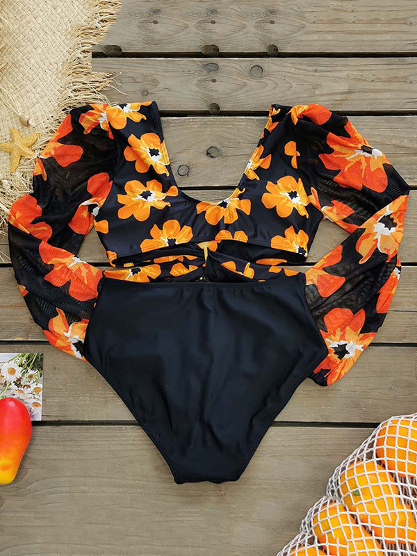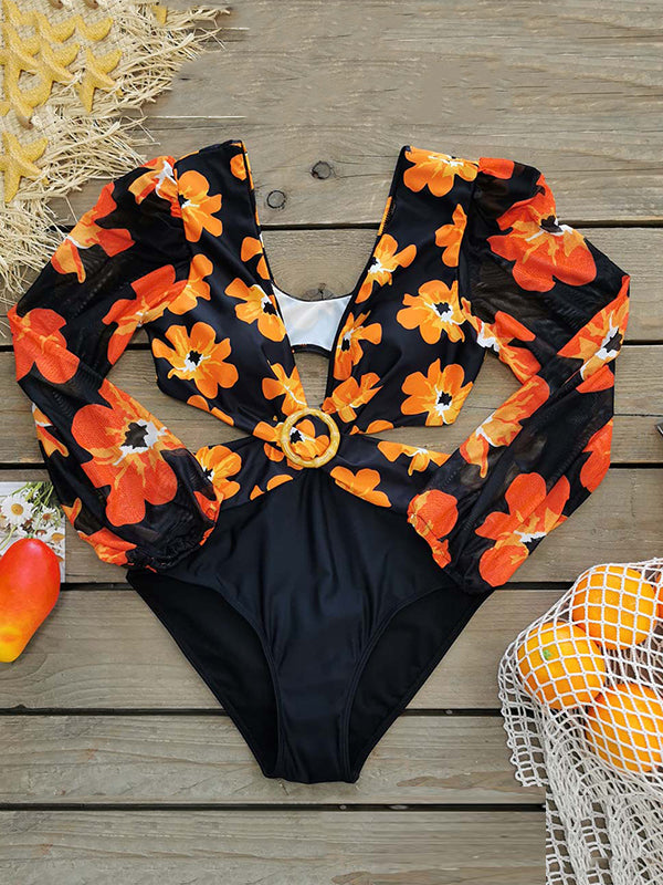 Puff Sleeves Deep V-Neck Printed One-Piece Swimsuit