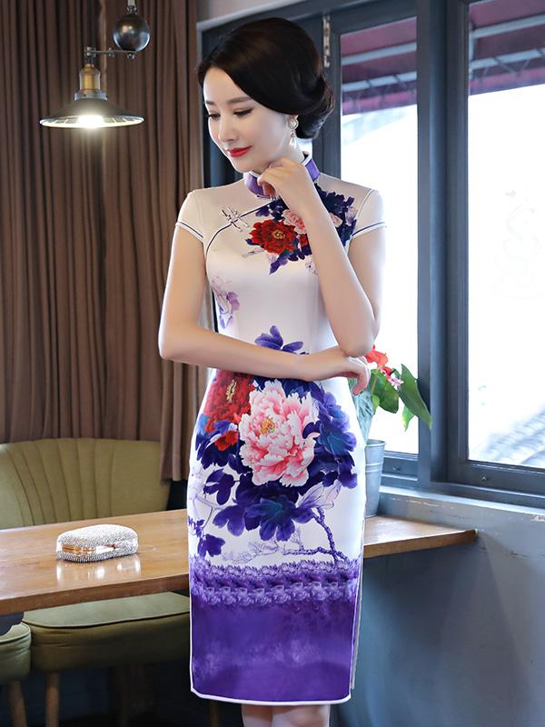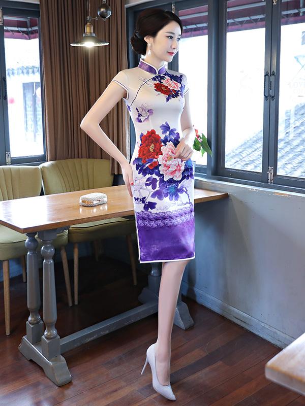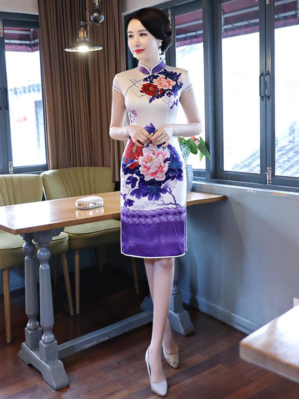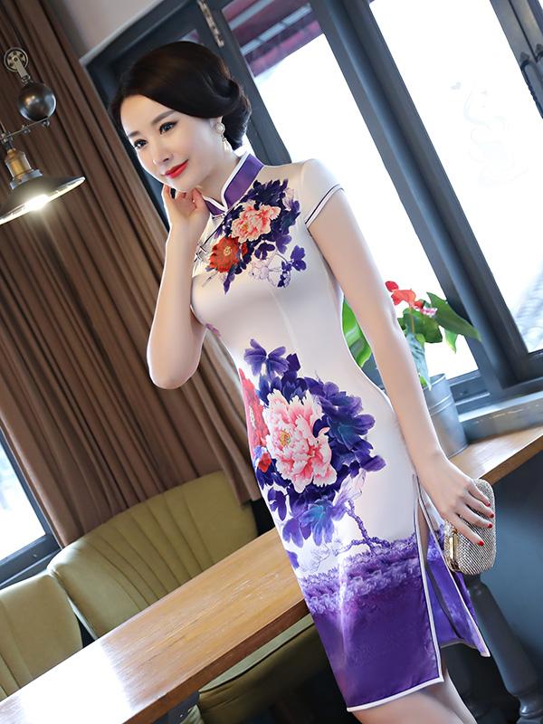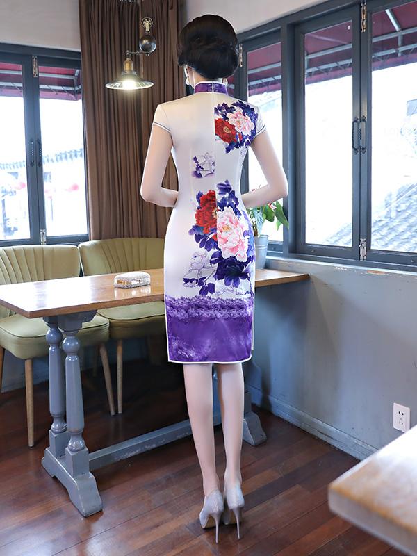Purple&White Peony Print Stand-collar Short Cheongsam