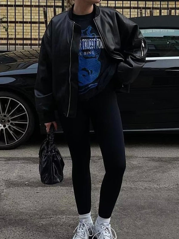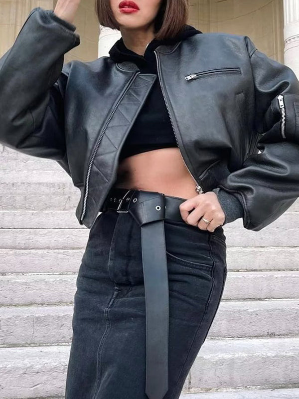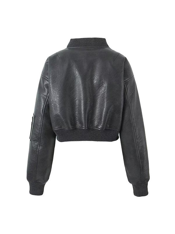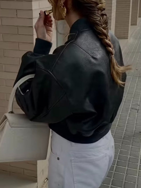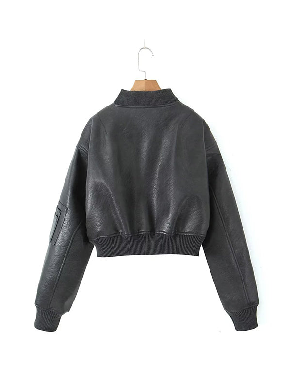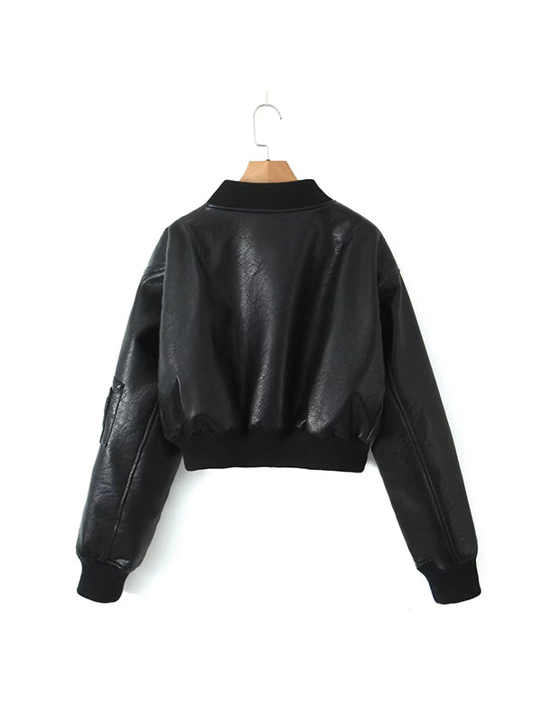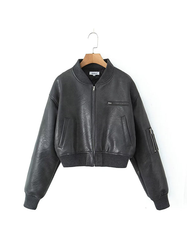 Quilted Solid Color Zipper Stand Collar PU Jackets Outerwear