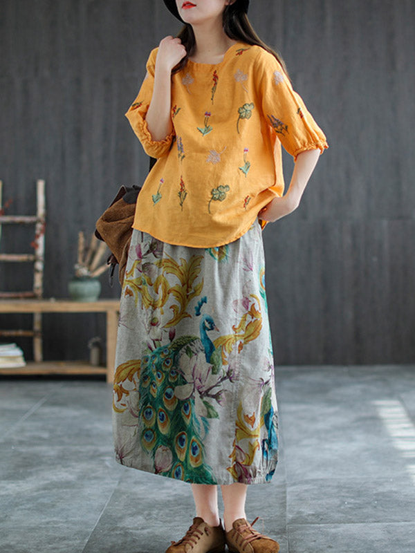Ramie Cotton Embroidered Round-Neck Short Sleeve T-Shirts Tops