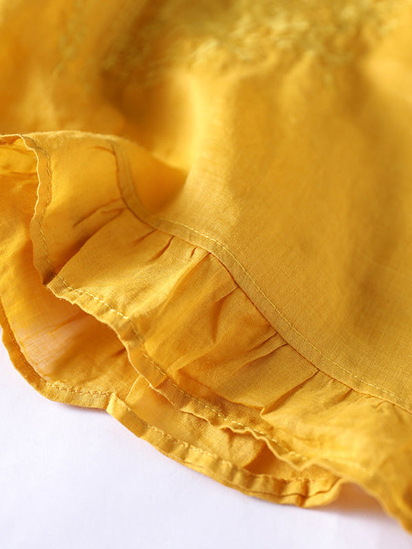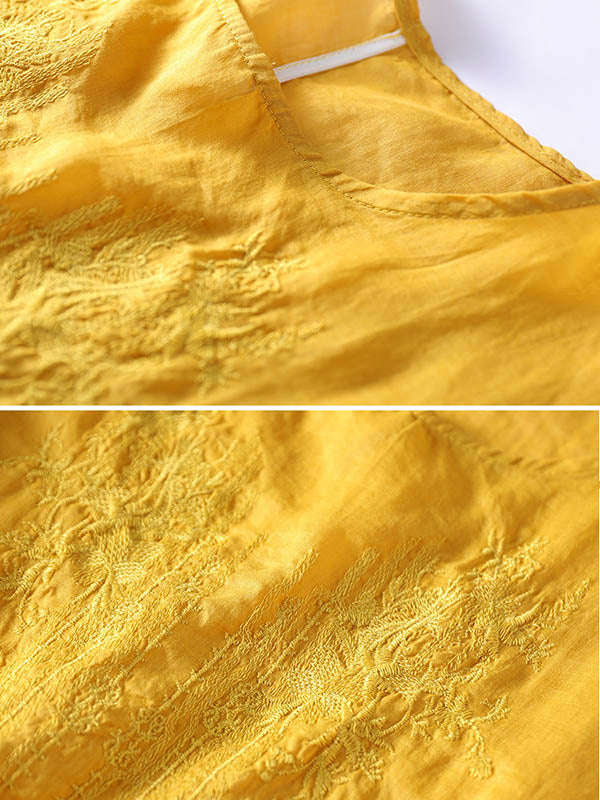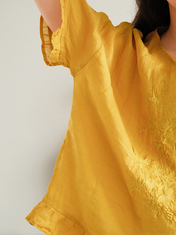 Ramie Cotton Embroidered Round-Neck T-Shirts Tops