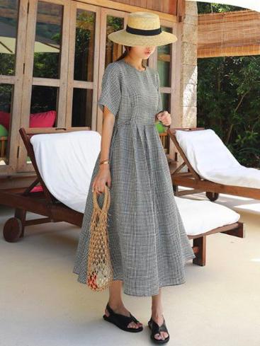 Ramie Cotton Plus Size Plaid Fresh Midi Dresses