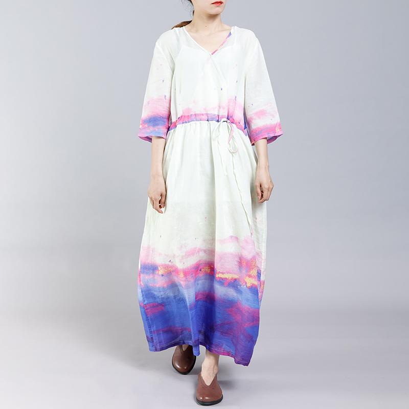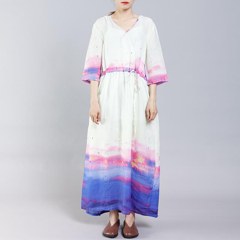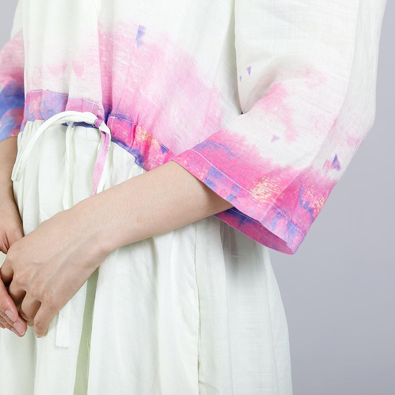 Ramie Indie Folk V-Neck Half Sleeve Dress