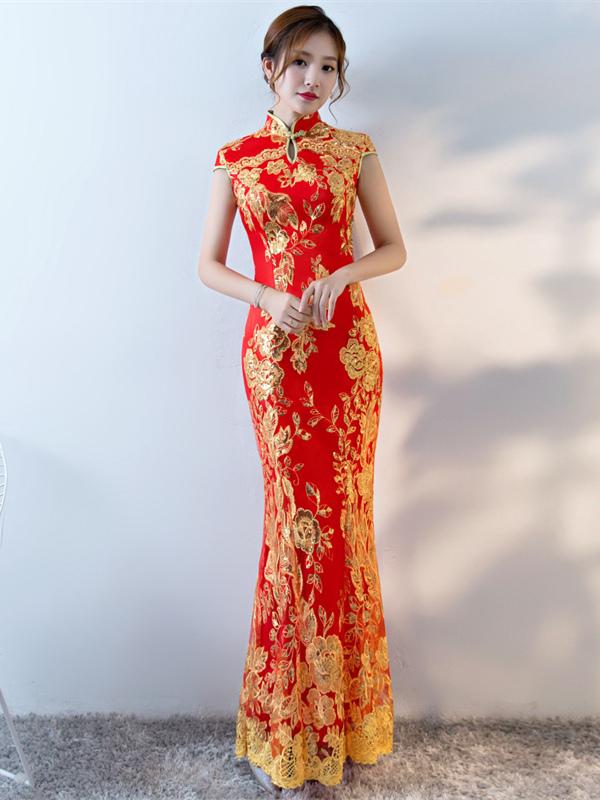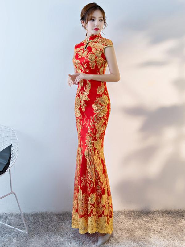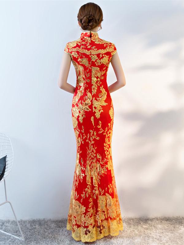 Red Lace Embroidered Mermaid Cheongsam Evening Dress