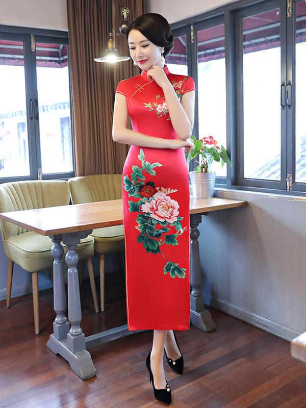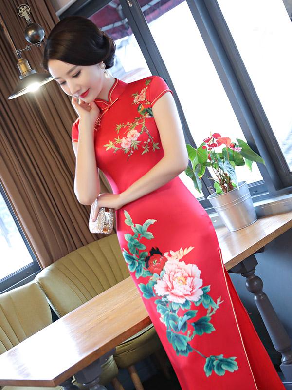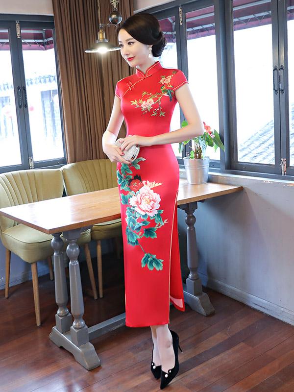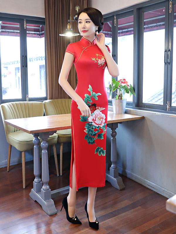 Red Peony Print Side Split Long Cheongsam